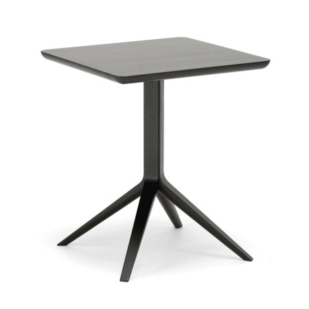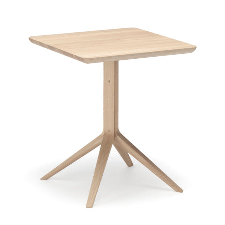 国産ナラ材を使用しており、2種類のカラー展開です。天板と脚部は、スチールパーツで固定されています。コンパクトなサイズで、カフェやレストラン、オフィスのミーティングスペース、家の小さなリビングスペースなどにぴったりです。正方形の天板は特に複数のテーブルを並べる場合に適しています。