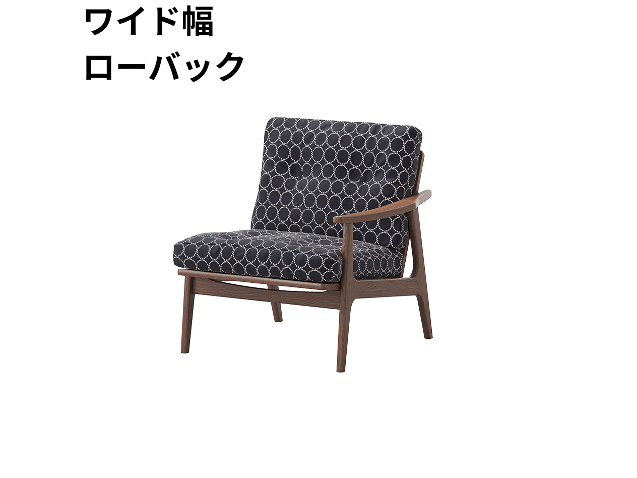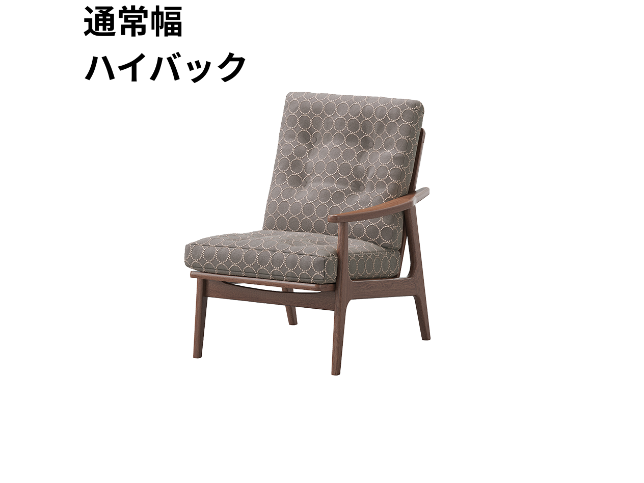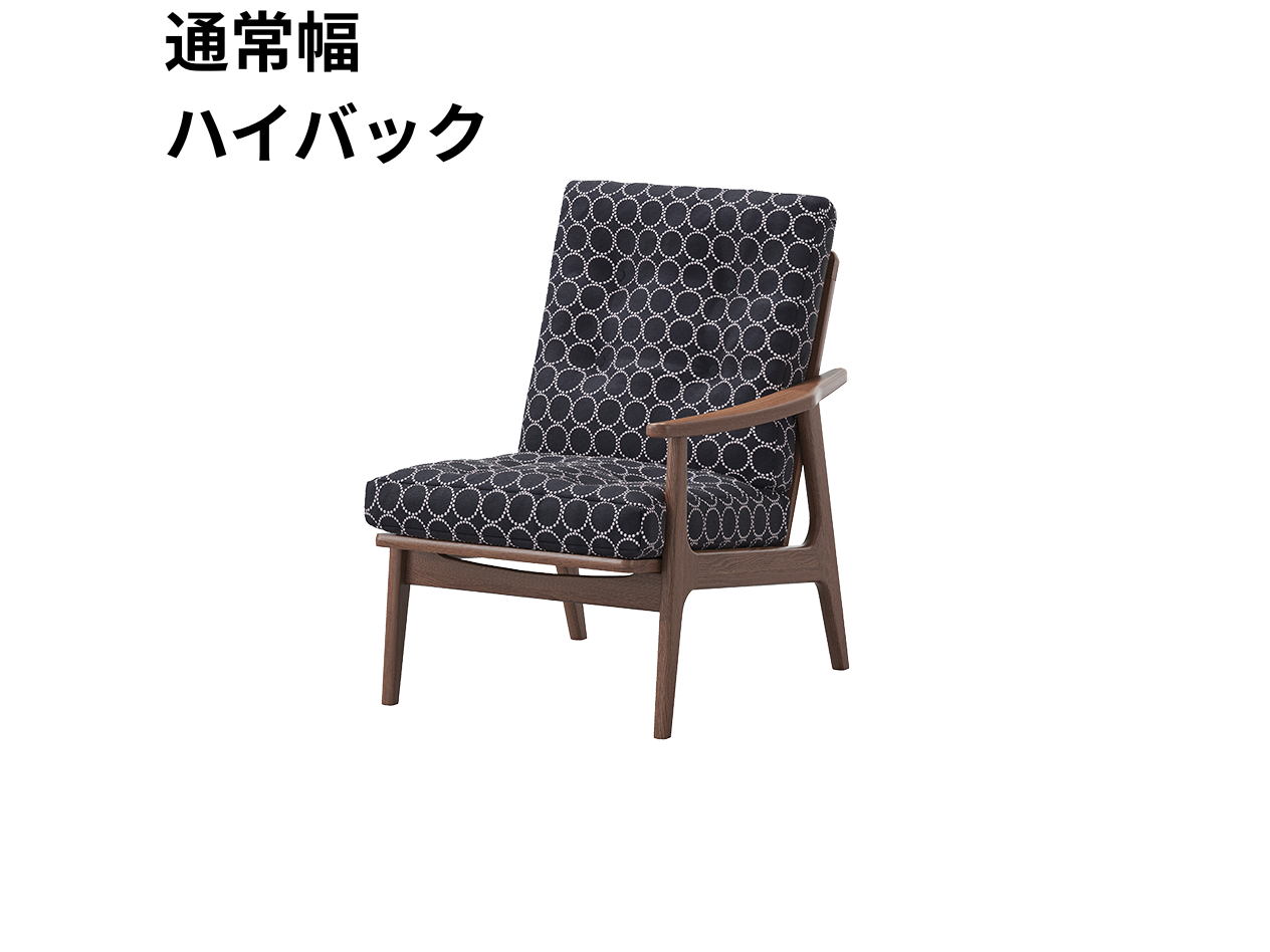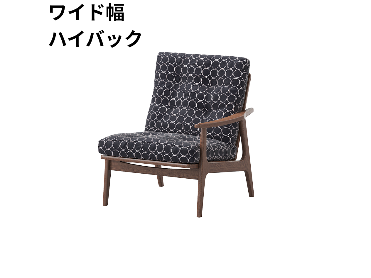 フレームサイズの4パターン。「ハイバック」は通常の高さ仕様(いわゆるローバック)よりも、クッションを約10㎝(背板は約7cm)高くして、安定感のある掛け心地を実現。更によりゆったりと過ごせるよう、幅方向に9cm広げた「ワイド」フレームも新たに加わりました。