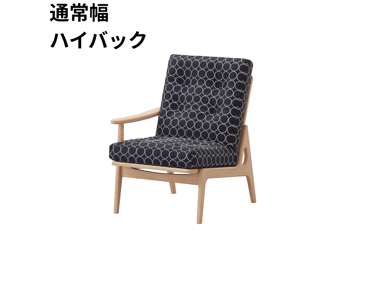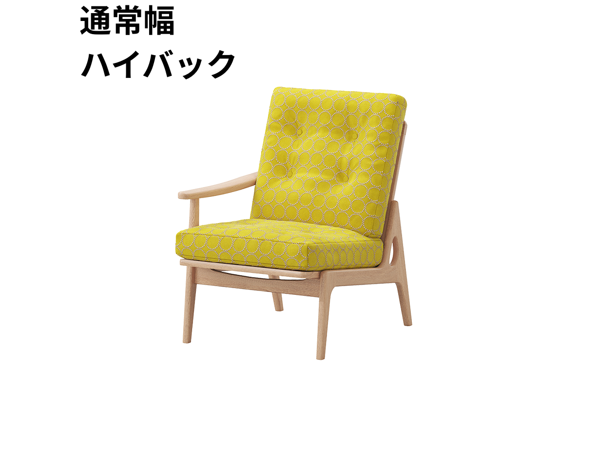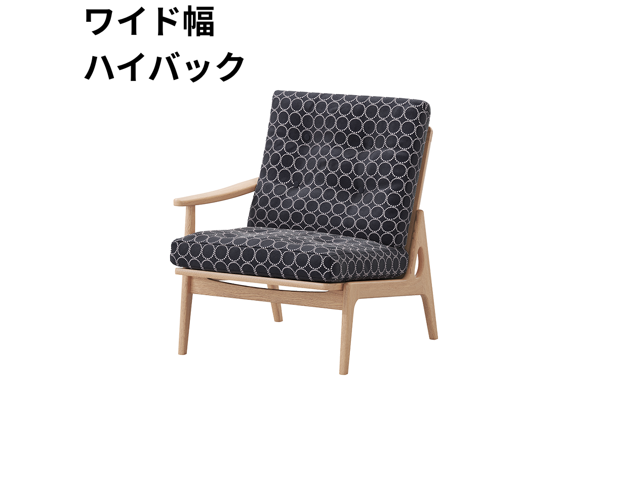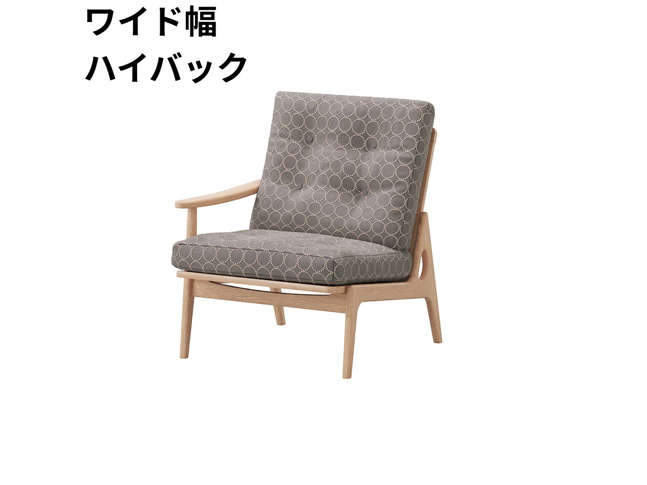 フレームサイズの4パターン。「ハイバック」は通常の高さ仕様(いわゆるローバック)よりも、クッションを約10㎝(背板は約7cm)高くして、安定感のある掛け心地を実現。更によりゆったりと過ごせるよう、幅方向に9cm広げた「ワイド」フレームも新たに加わりました。