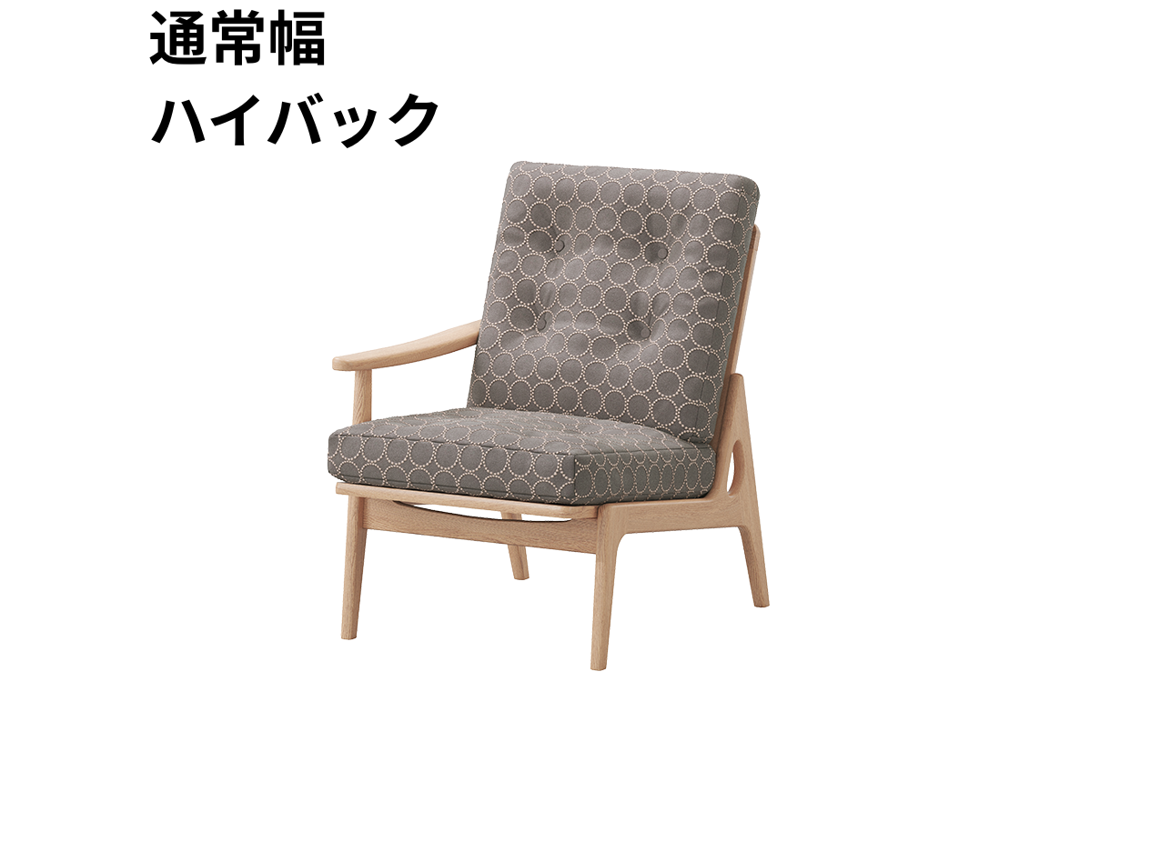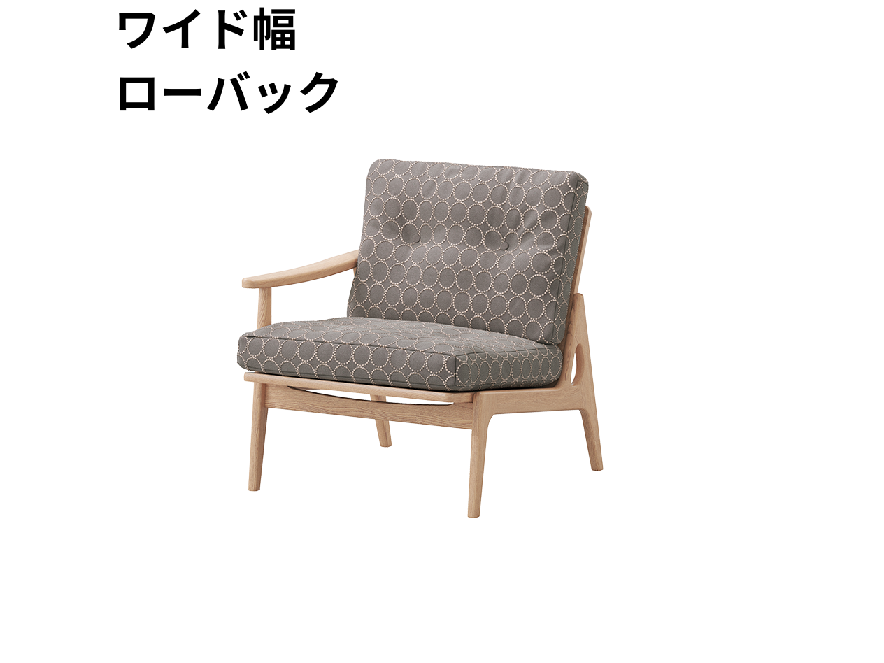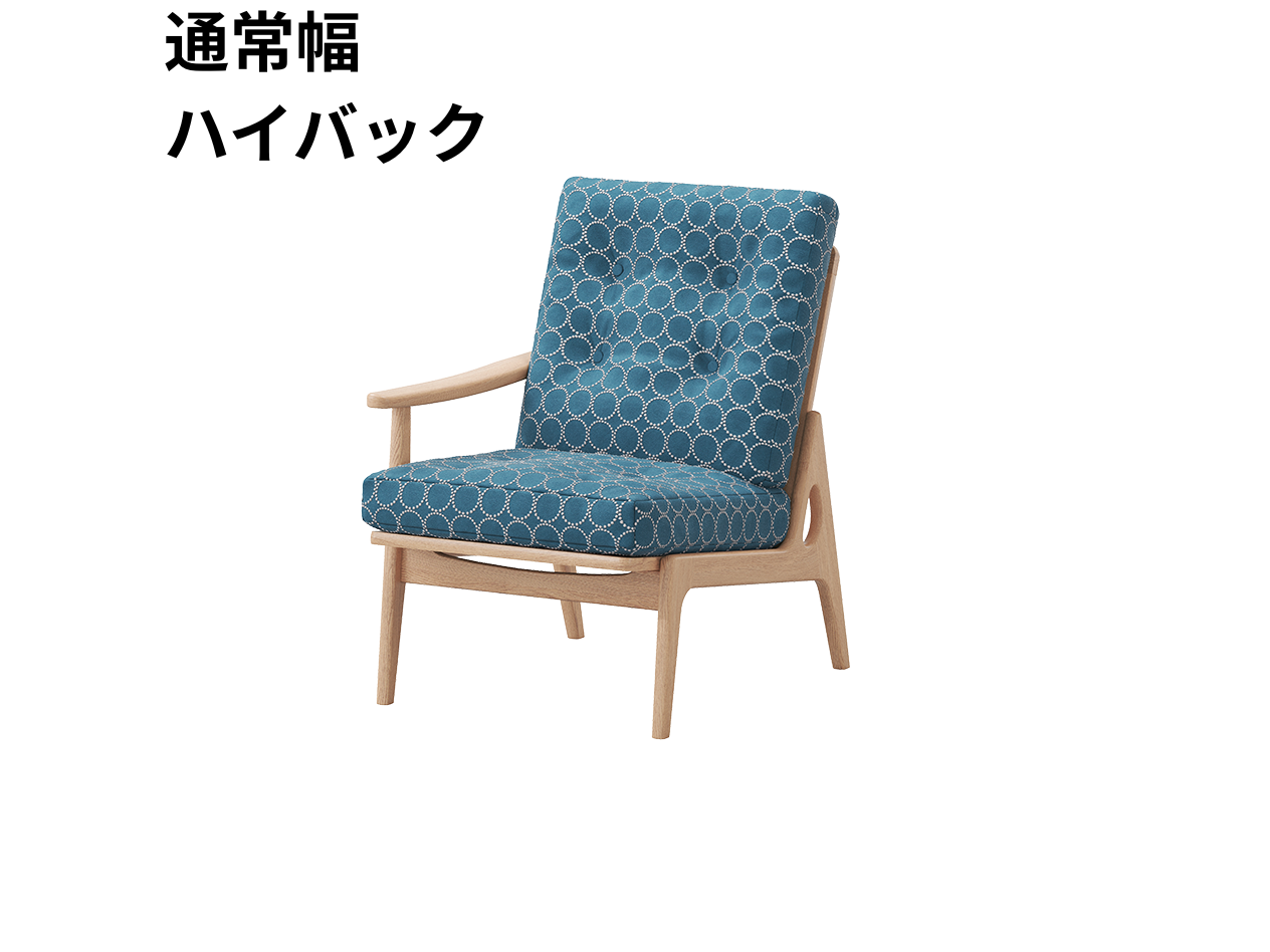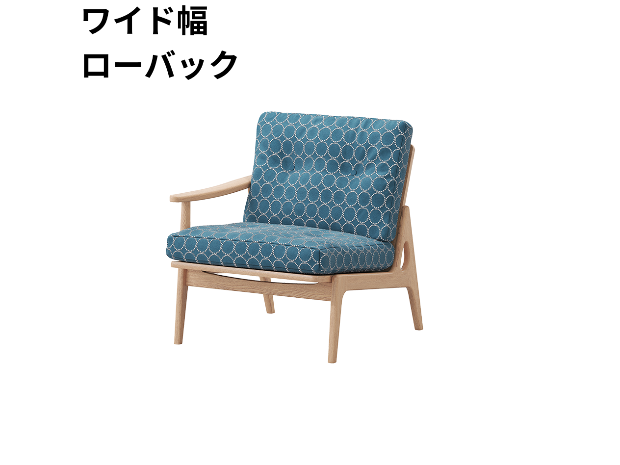 フレームサイズの4パターン。「ハイバック」は通常の高さ仕様(いわゆるローバック)よりも、クッションを約10㎝(背板は約7cm)高くして、安定感のある掛け心地を実現。更によりゆったりと過ごせるよう、幅方向に9cm広げた「ワイド」フレームも新たに加わりました。