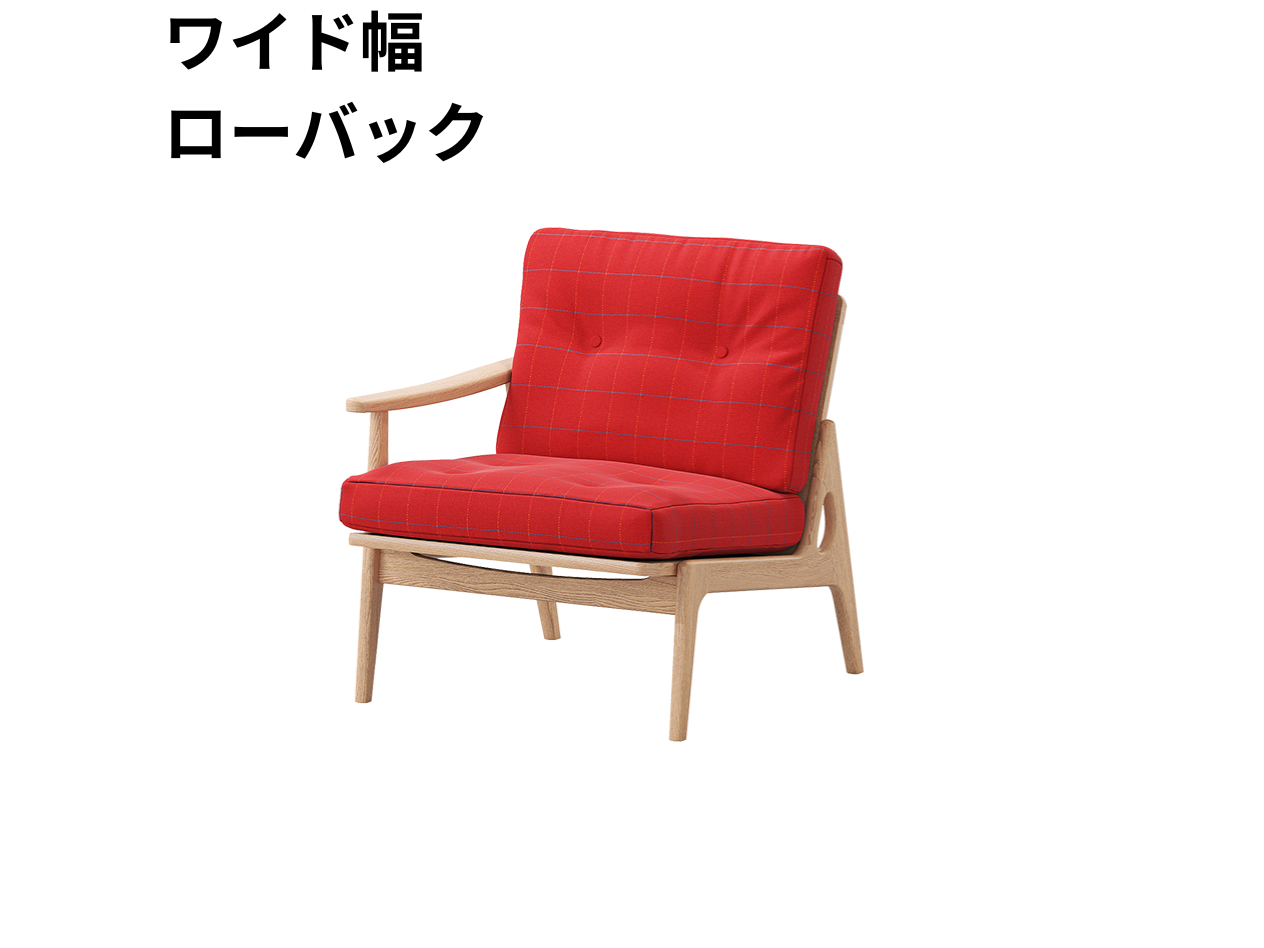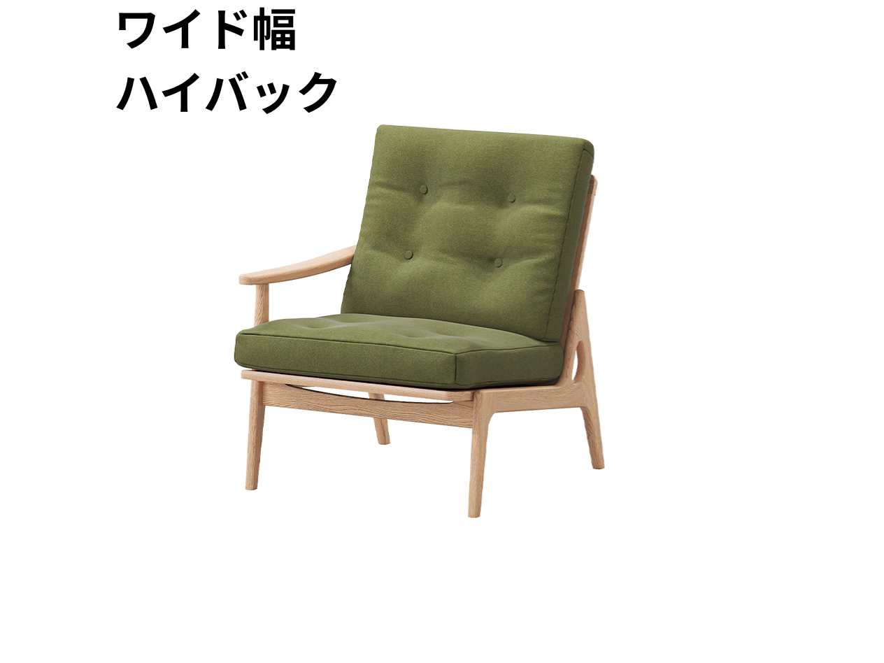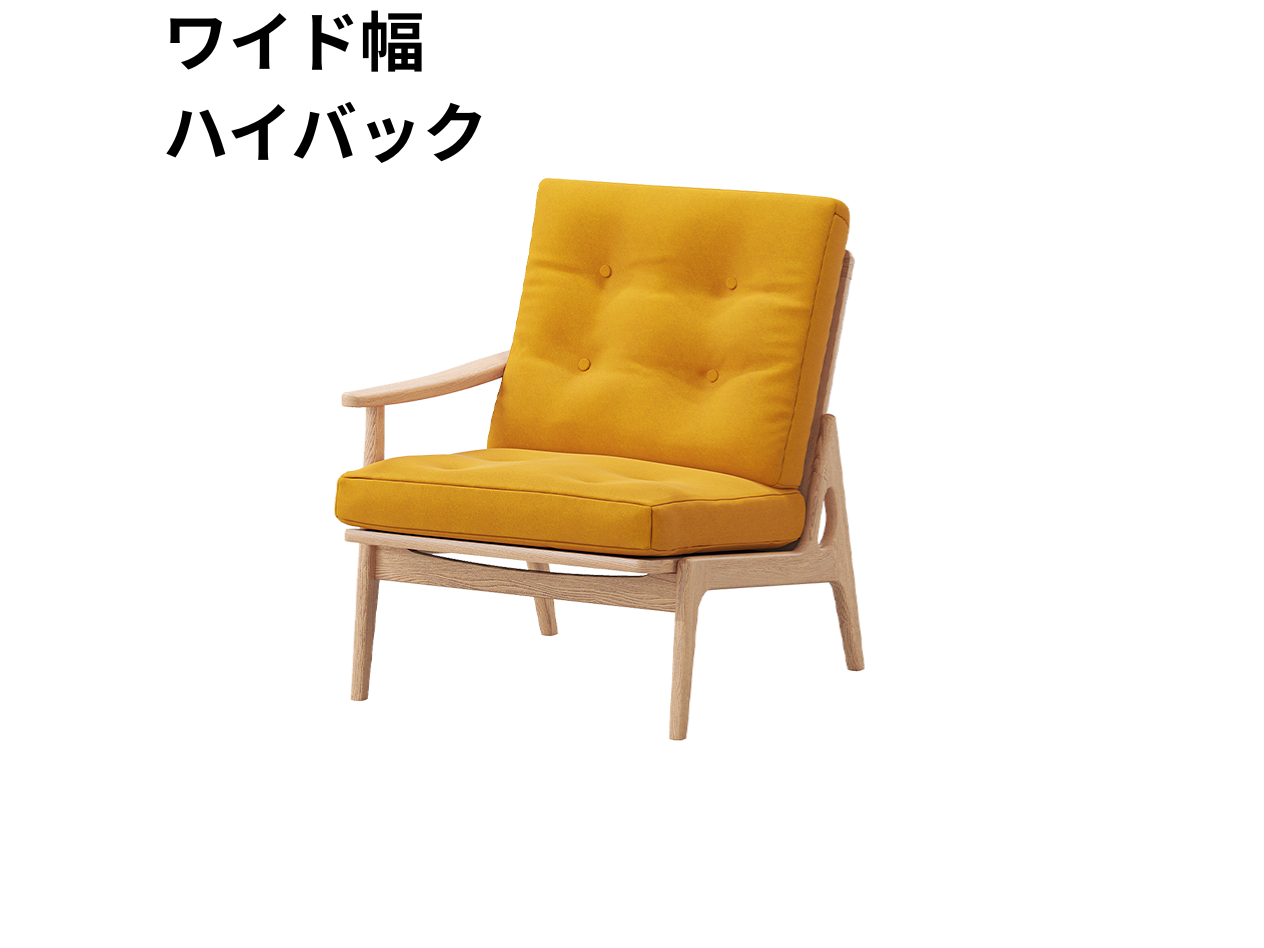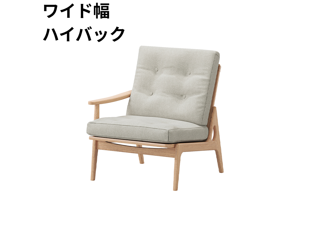 フレームサイズの4パターン。「ハイバック」は通常の高さ仕様(いわゆるローバック)よりも、クッションを約10㎝(背板は約7cm)高くして、安定感のある掛け心地を実現。更によりゆったりと過ごせるよう、幅方向に9cm広げた「ワイド」フレームも新たに加わりました。