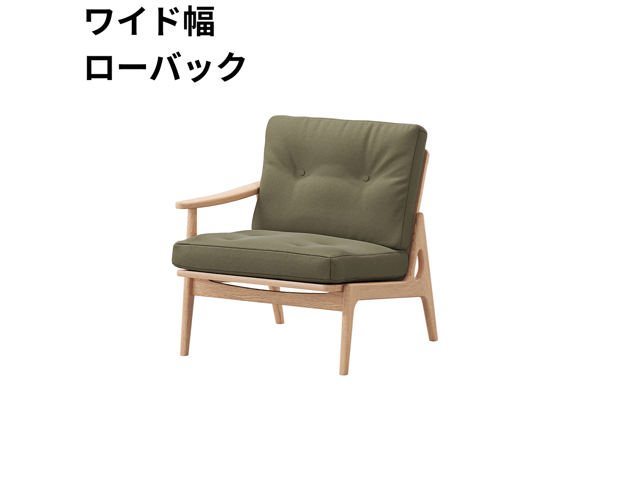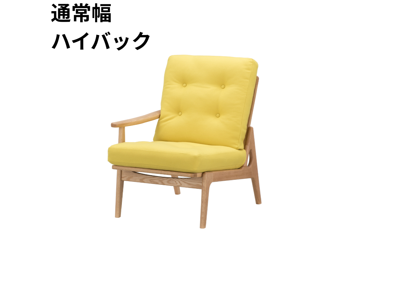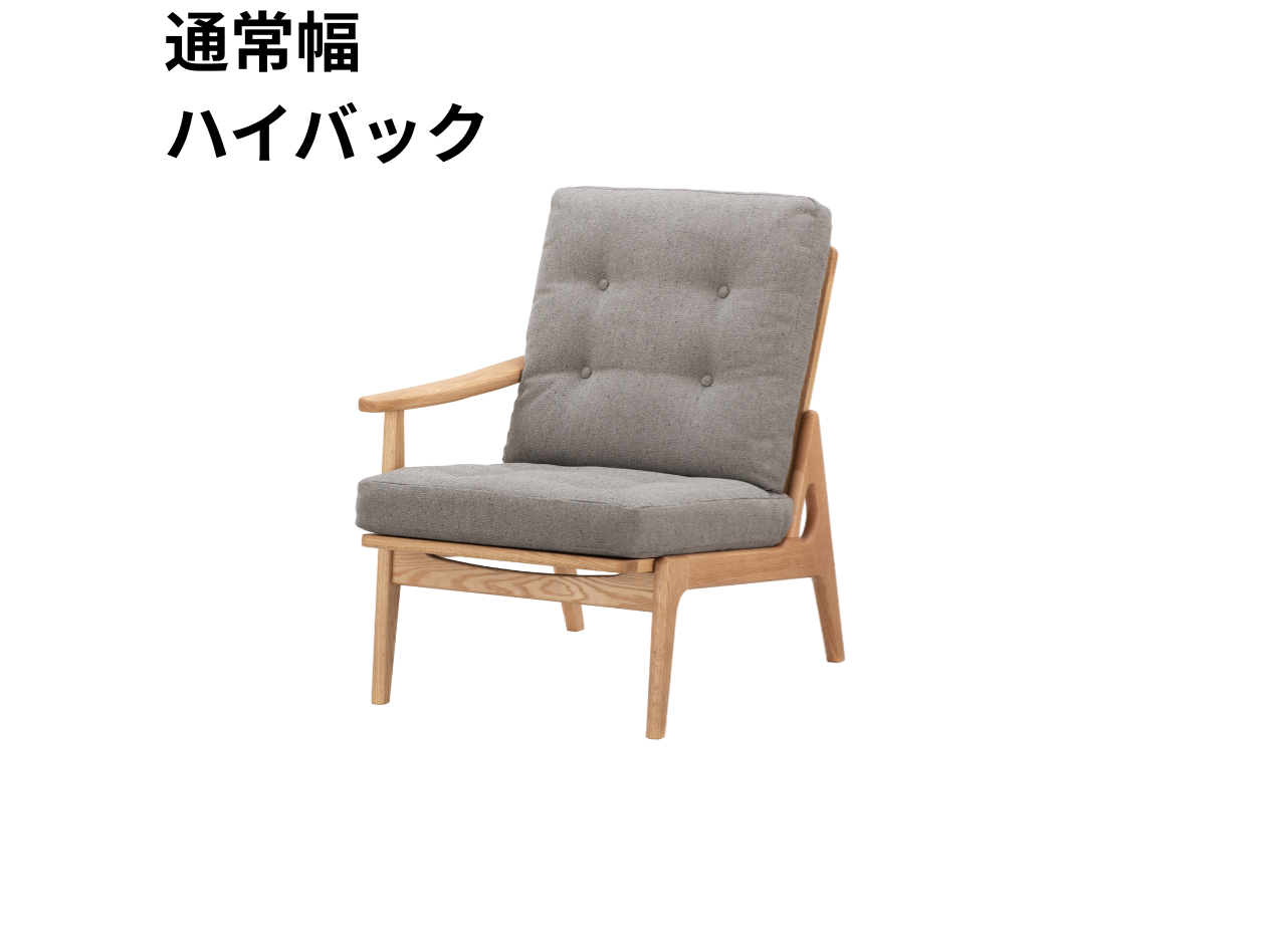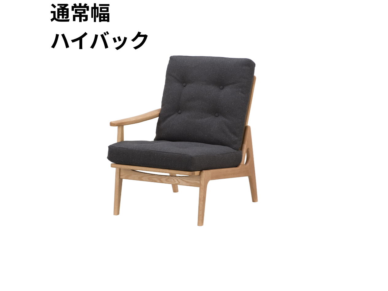 フレームサイズの4パターン。「ハイバック」は通常の高さ仕様(いわゆるローバック)よりも、クッションを約10㎝(背板は約7cm)高くして、安定感のある掛け心地を実現。更によりゆったりと過ごせるよう、幅方向に9cm広げた「ワイド」フレームも新たに加わりました。