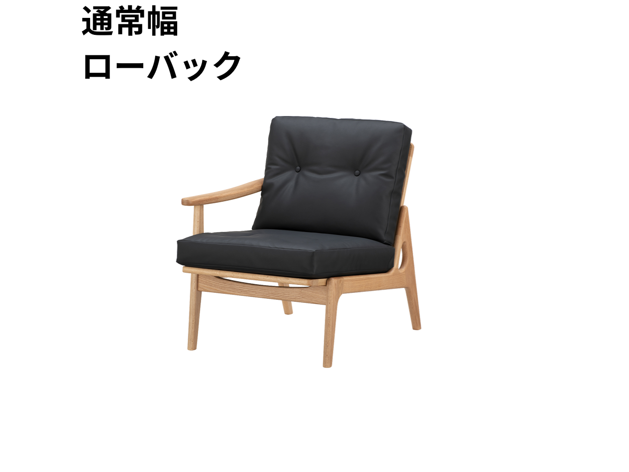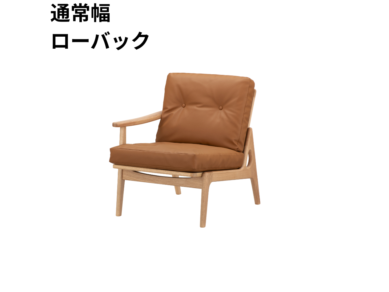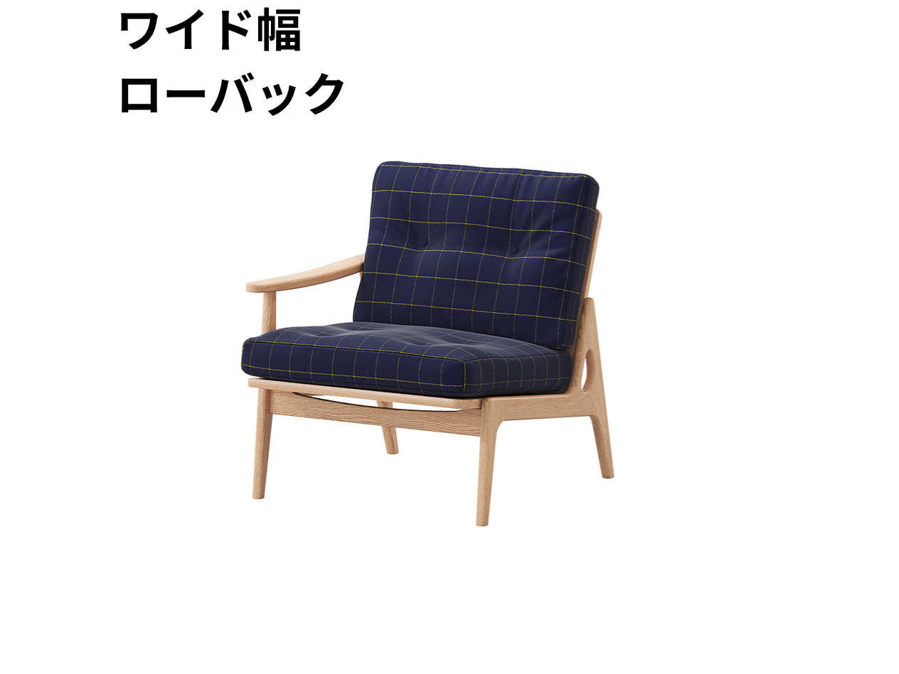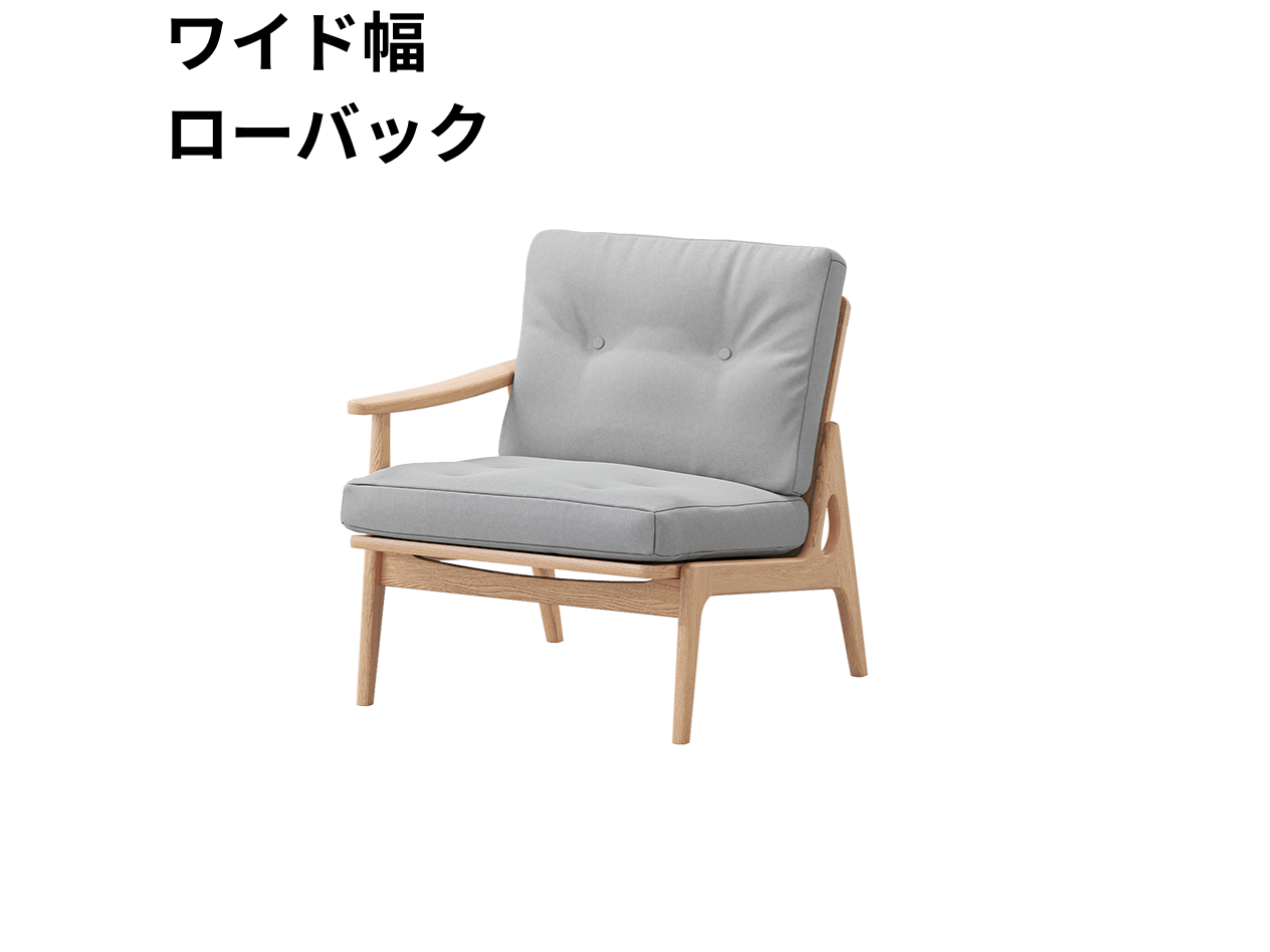 フレームサイズの4パターン。「ハイバック」は通常の高さ仕様(いわゆるローバック)よりも、クッションを約10㎝(背板は約7cm)高くして、安定感のある掛け心地を実現。更によりゆったりと過ごせるよう、幅方向に9cm広げた「ワイド」フレームも新たに加わりました。