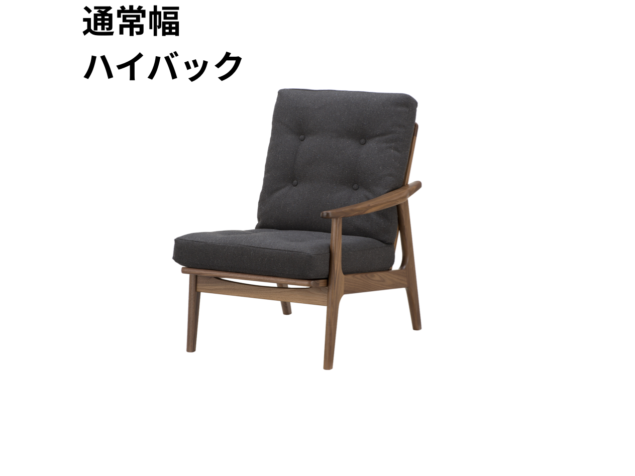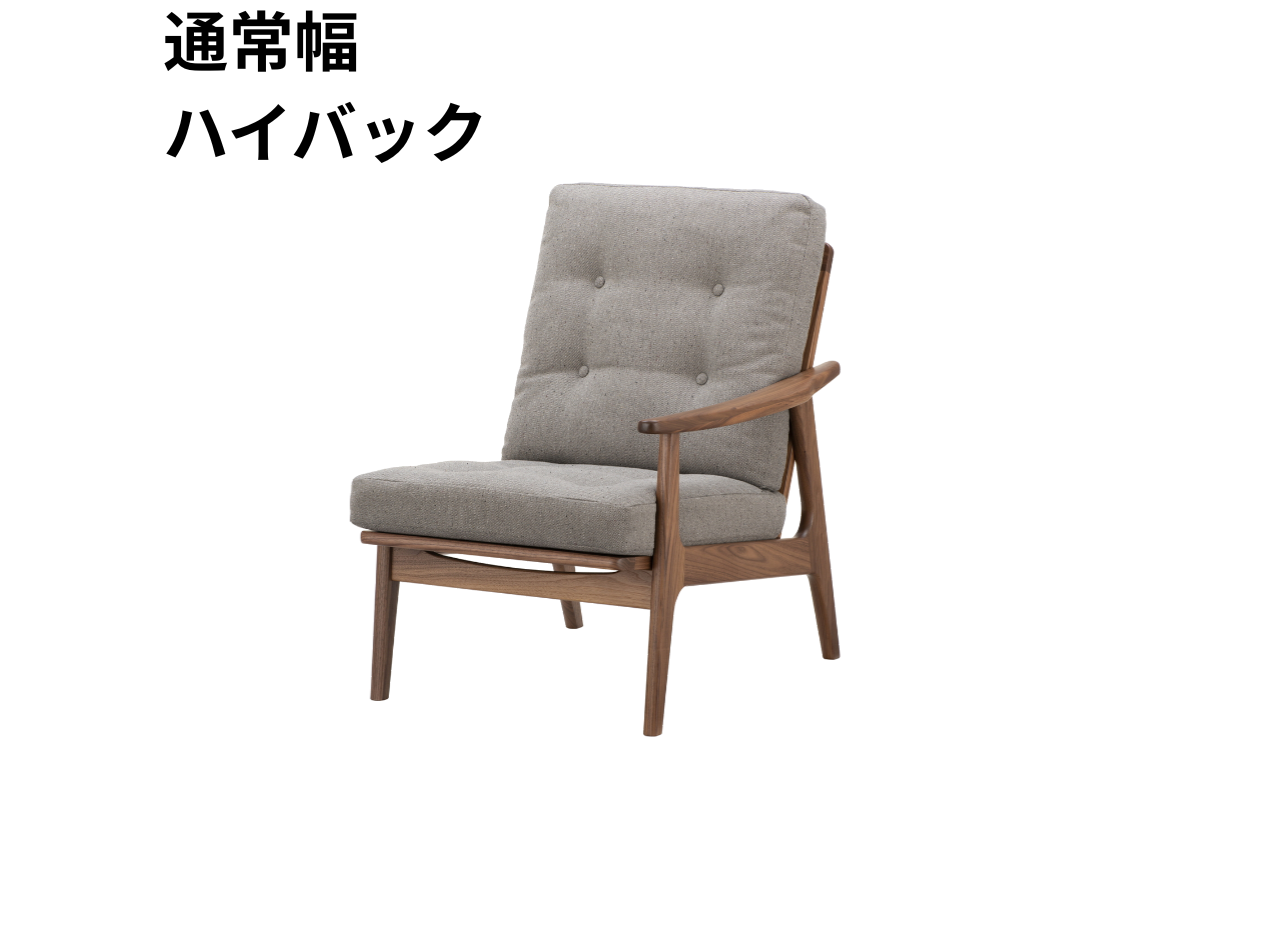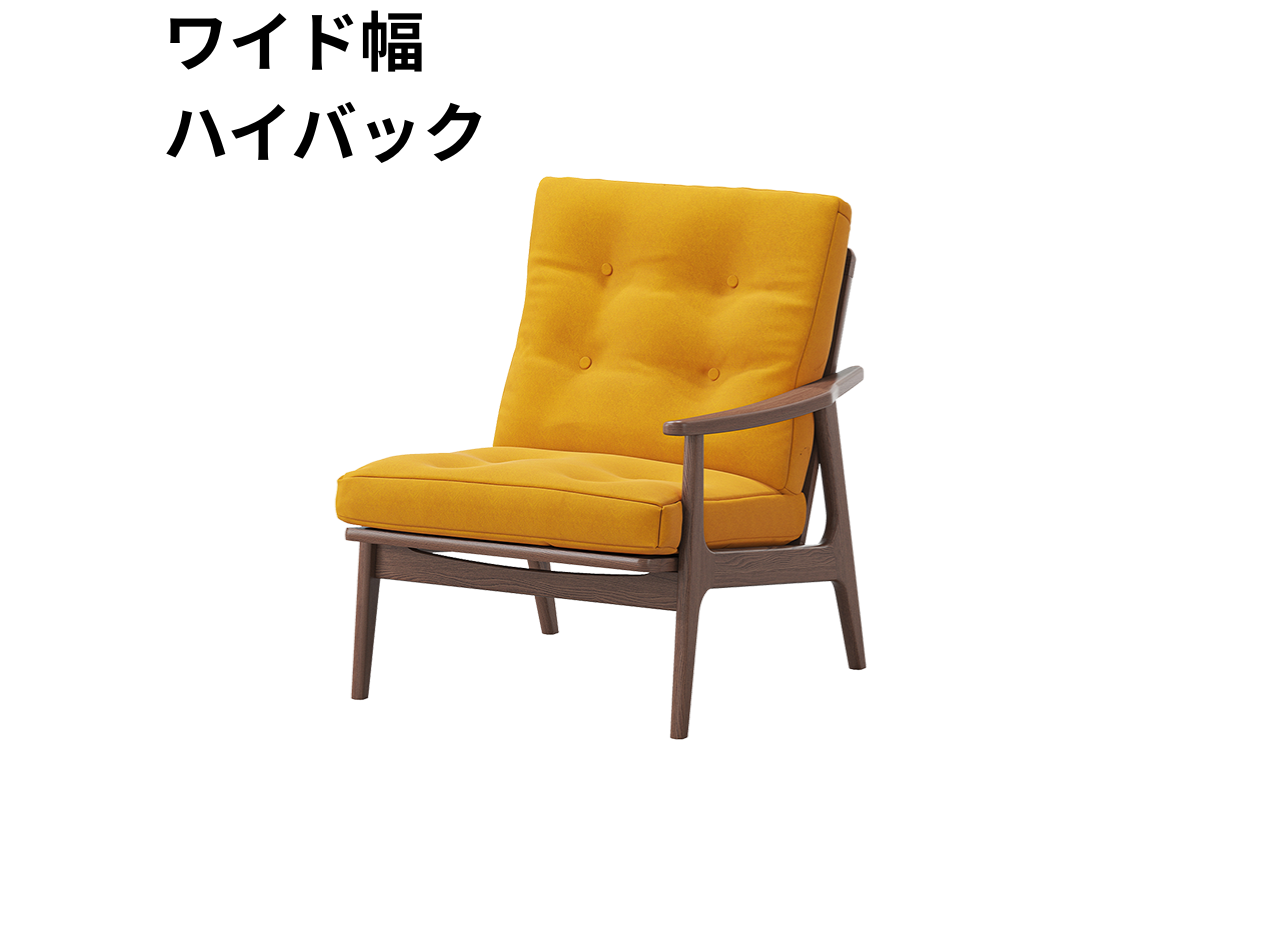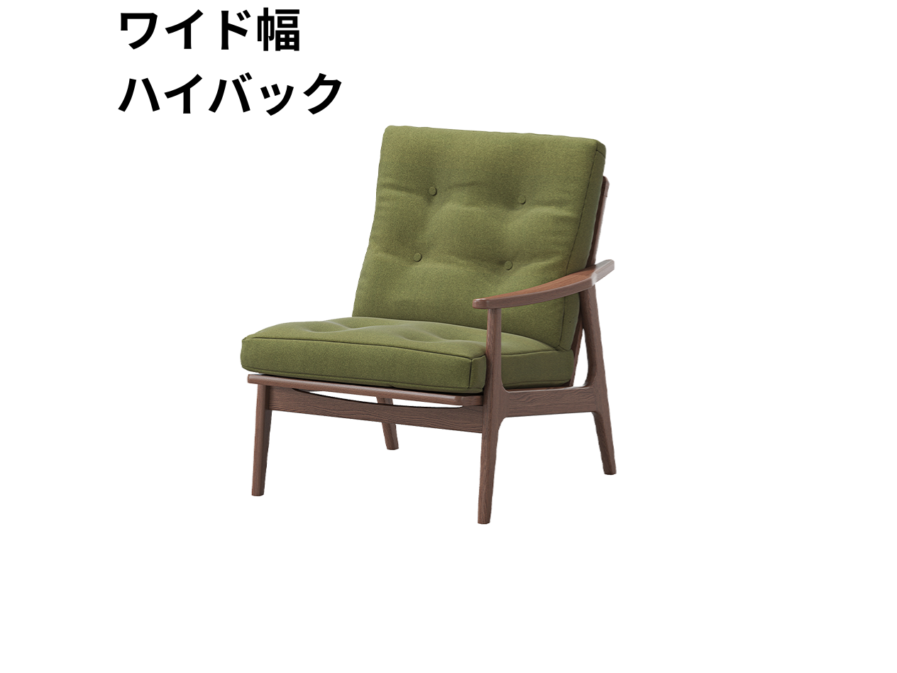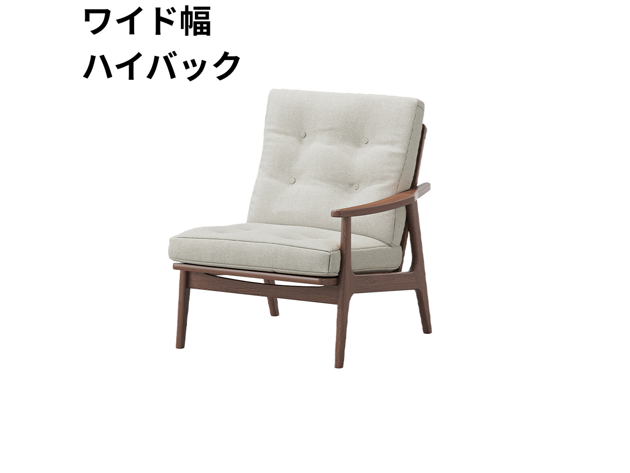 フレームサイズの4パターン。「ハイバック」は通常の高さ仕様(いわゆるローバック)よりも、クッションを約10㎝(背板は約7cm)高くして、安定感のある掛け心地を実現。更によりゆったりと過ごせるよう、幅方向に9cm広げた「ワイド」フレームも新たに加わりました。