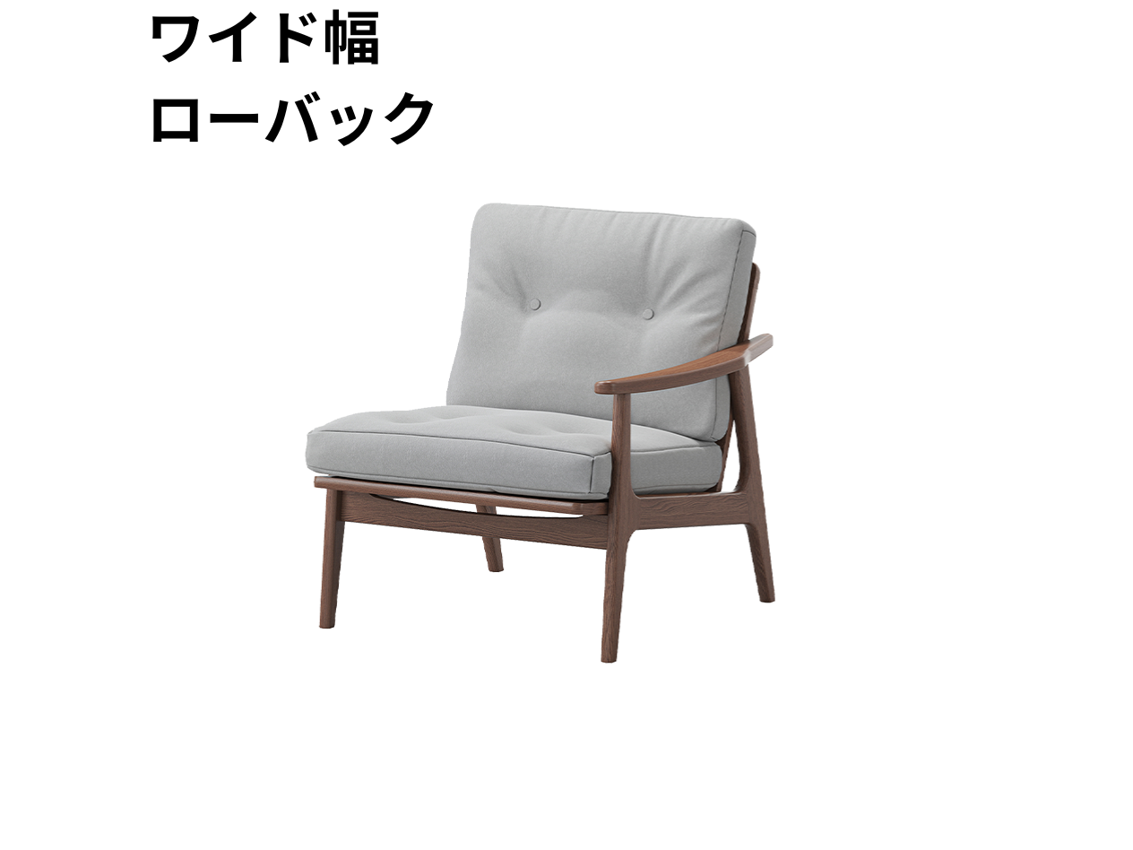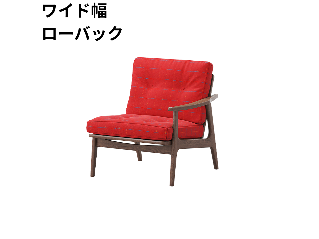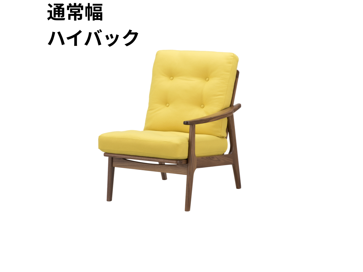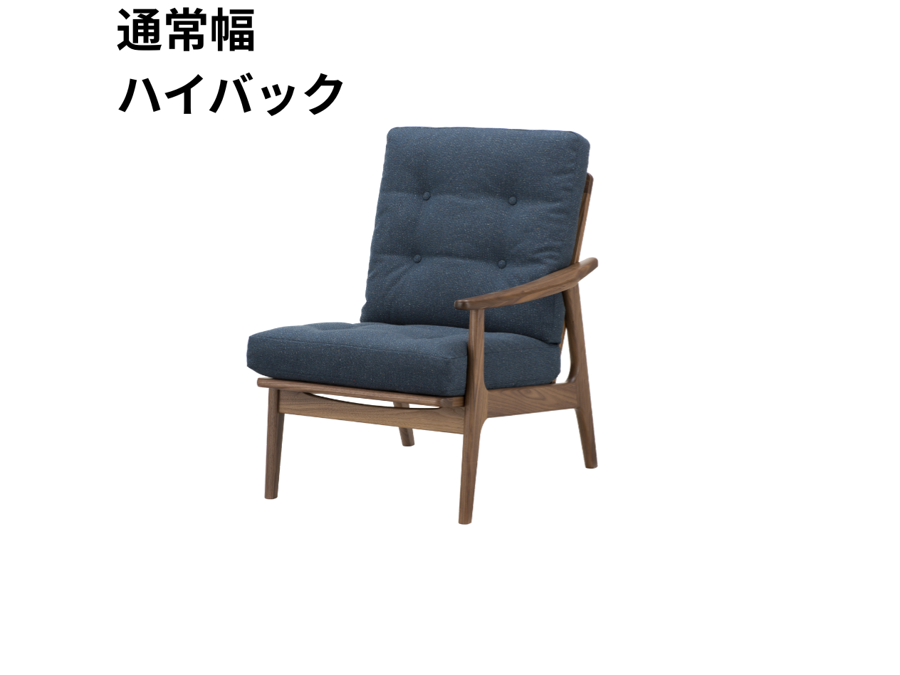 フレームサイズの4パターン。「ハイバック」は通常の高さ仕様(いわゆるローバック)よりも、クッションを約10㎝(背板は約7cm)高くして、安定感のある掛け心地を実現。更によりゆったりと過ごせるよう、幅方向に9cm広げた「ワイド」フレームも新たに加わりました。