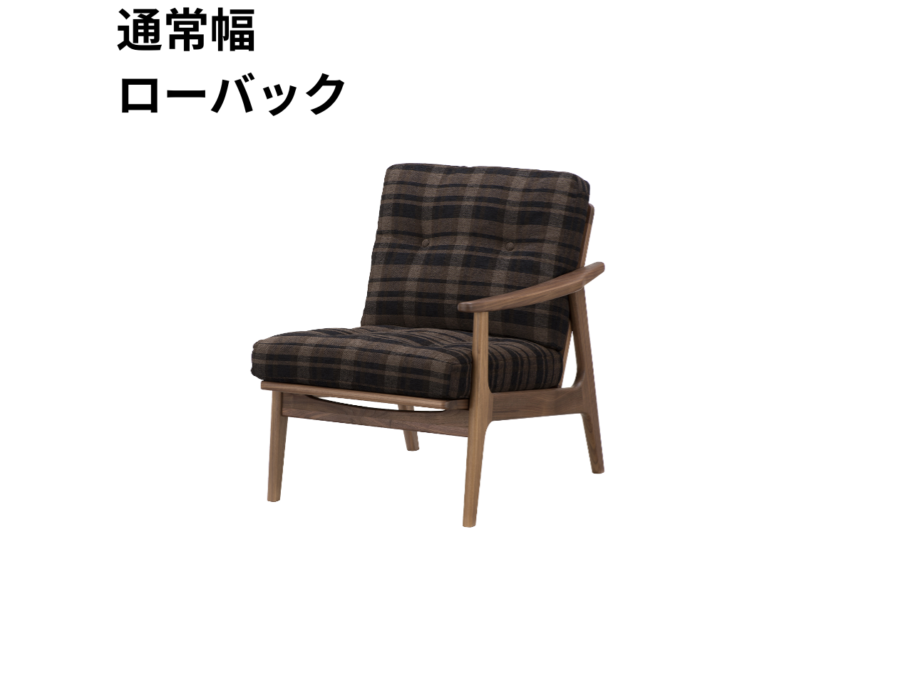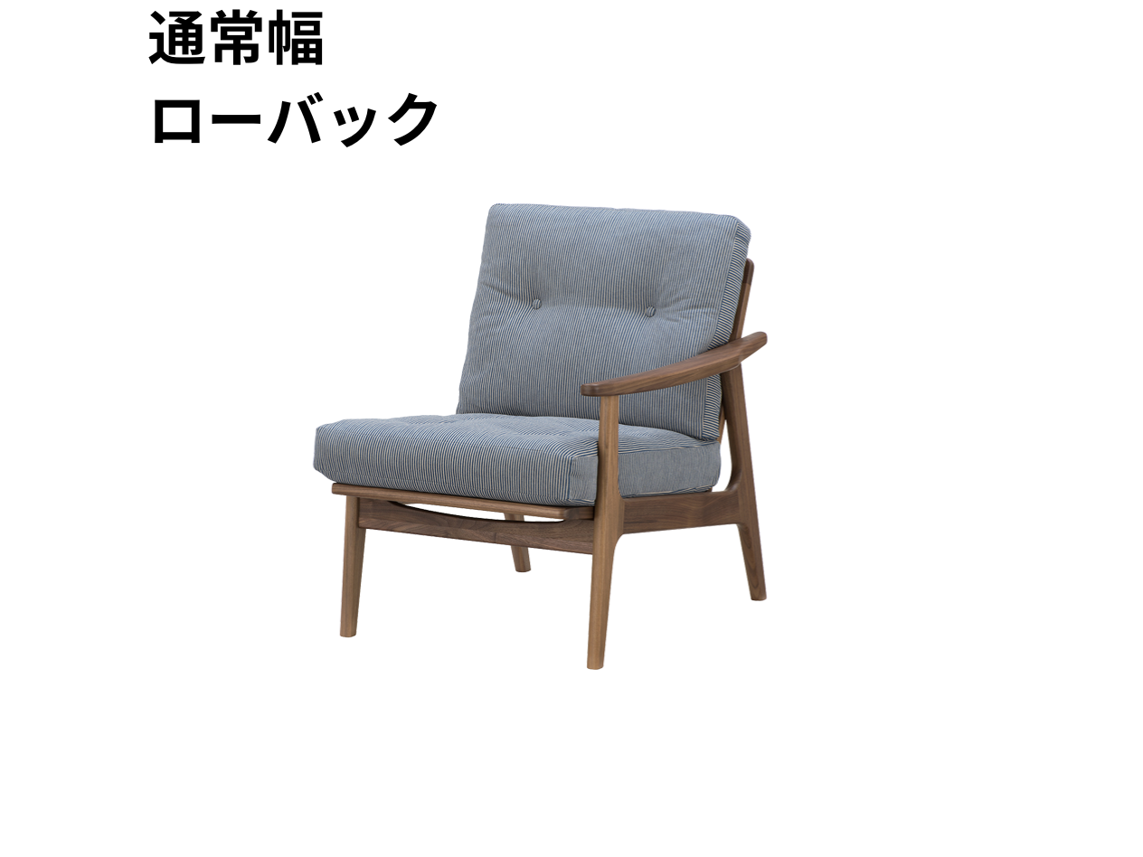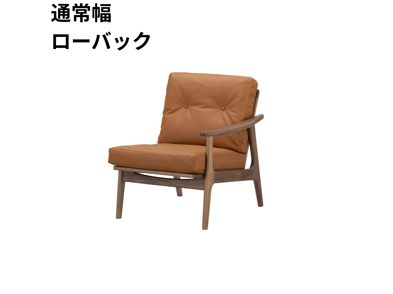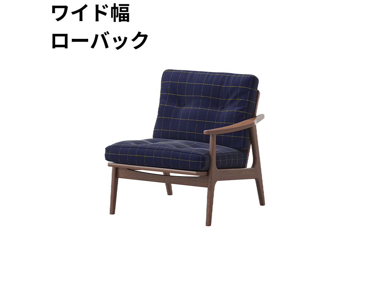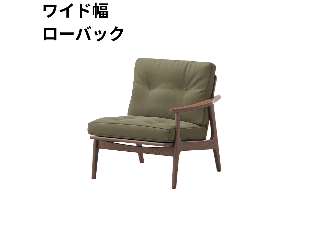フレームサイズの4パターン。「ハイバック」は通常の高さ仕様(いわゆるローバック)よりも、クッションを約10㎝(背板は約7cm)高くして、安定感のある掛け心地を実現。更によりゆったりと過ごせるよう、幅方向に9cm広げた「ワイド」フレームも新たに加わりました。
