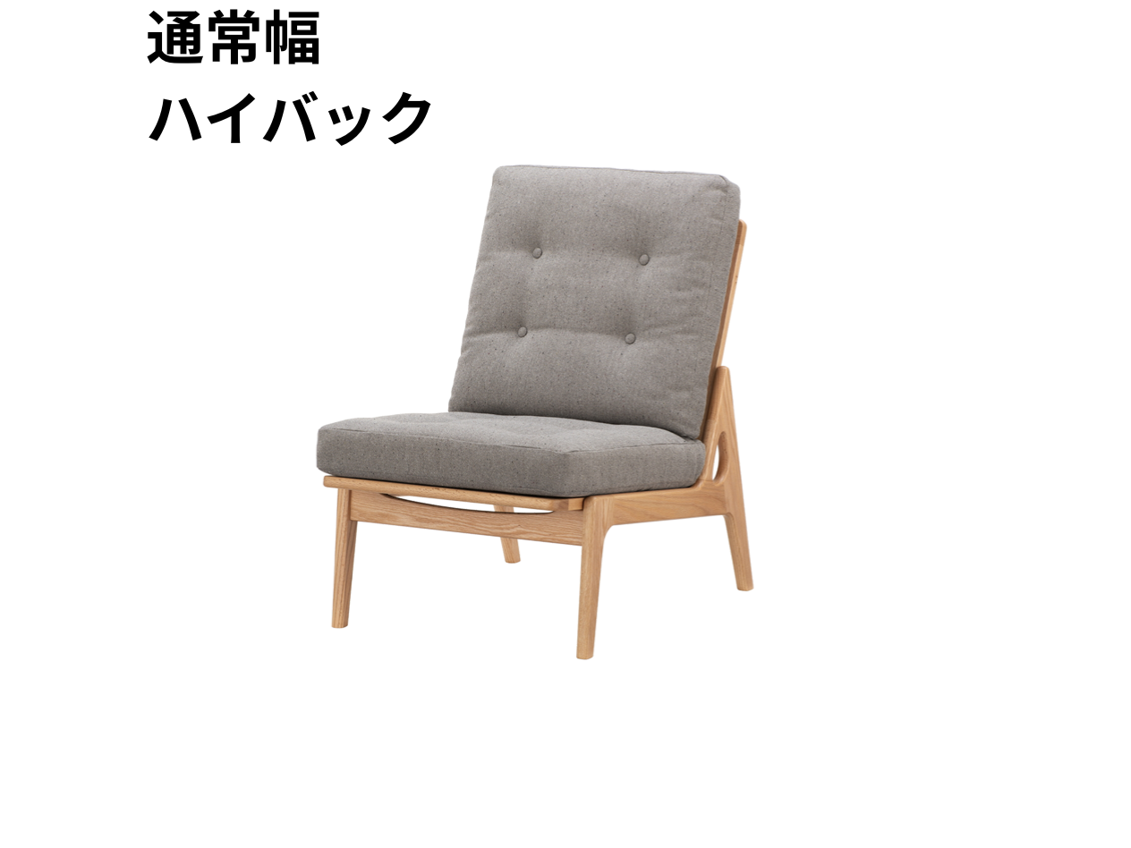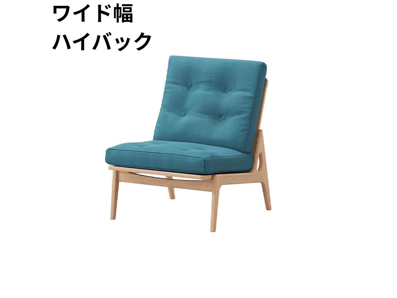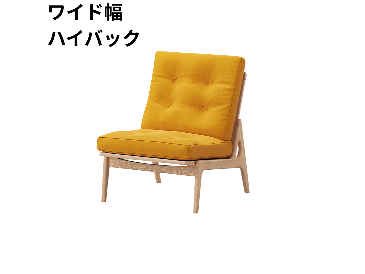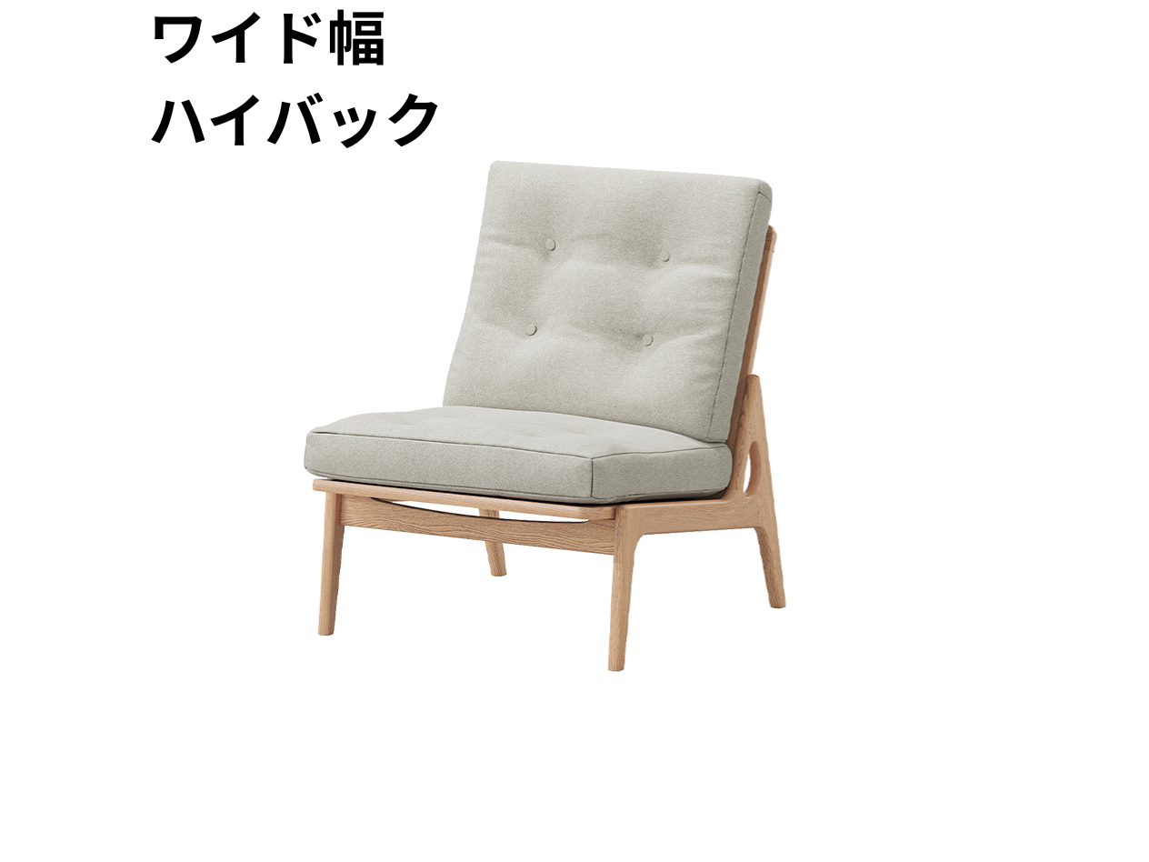 フレームサイズの4パターン。「ハイバック」は通常の高さ仕様(いわゆるローバック)よりも、クッションを約10㎝(背板は約7cm)高くして、安定感のある掛け心地を実現。更によりゆったりと過ごせるよう、幅方向に9cm広げた「ワイド」フレームも新たに加わりました。