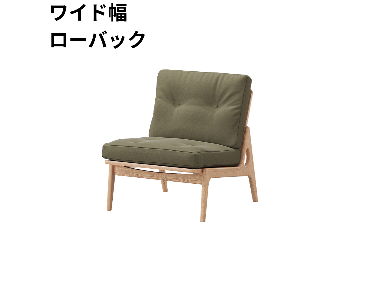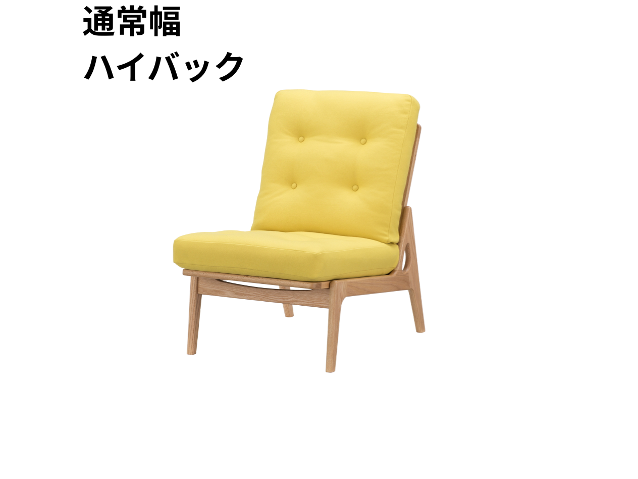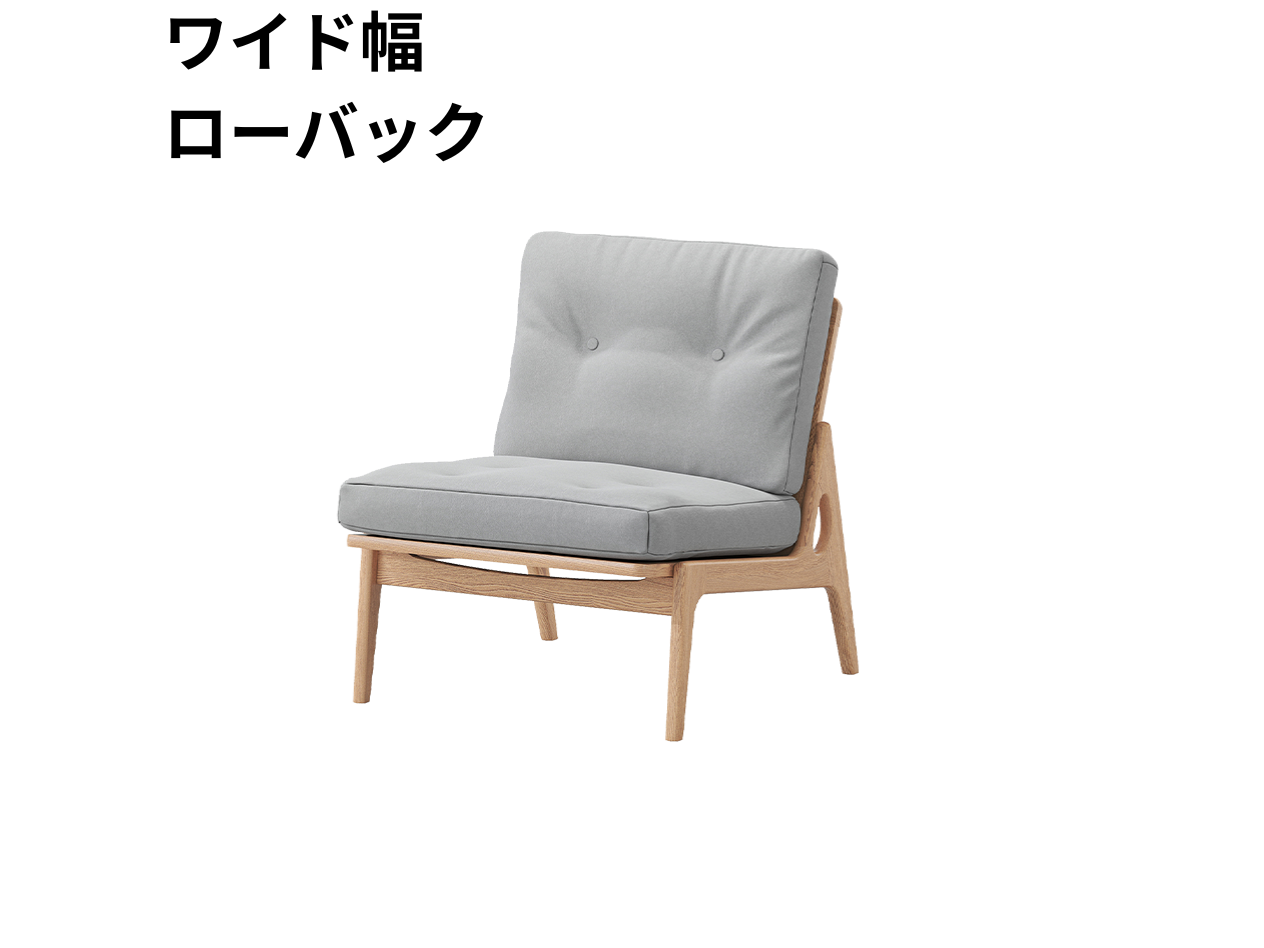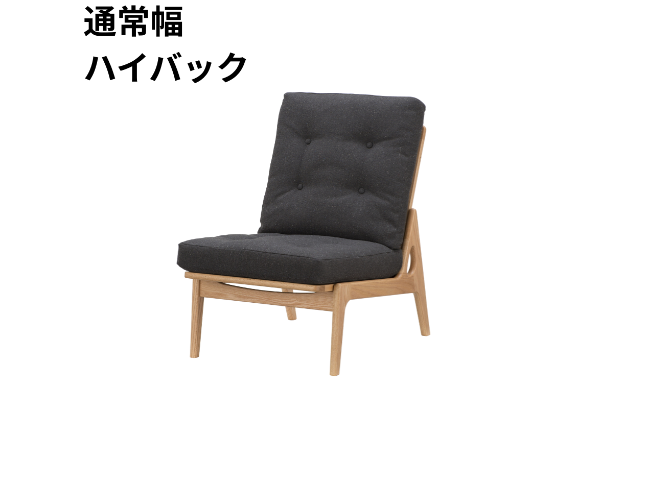 フレームサイズの4パターン。「ハイバック」は通常の高さ仕様(いわゆるローバック)よりも、クッションを約10㎝(背板は約7cm)高くして、安定感のある掛け心地を実現。更によりゆったりと過ごせるよう、幅方向に9cm広げた「ワイド」フレームも新たに加わりました。