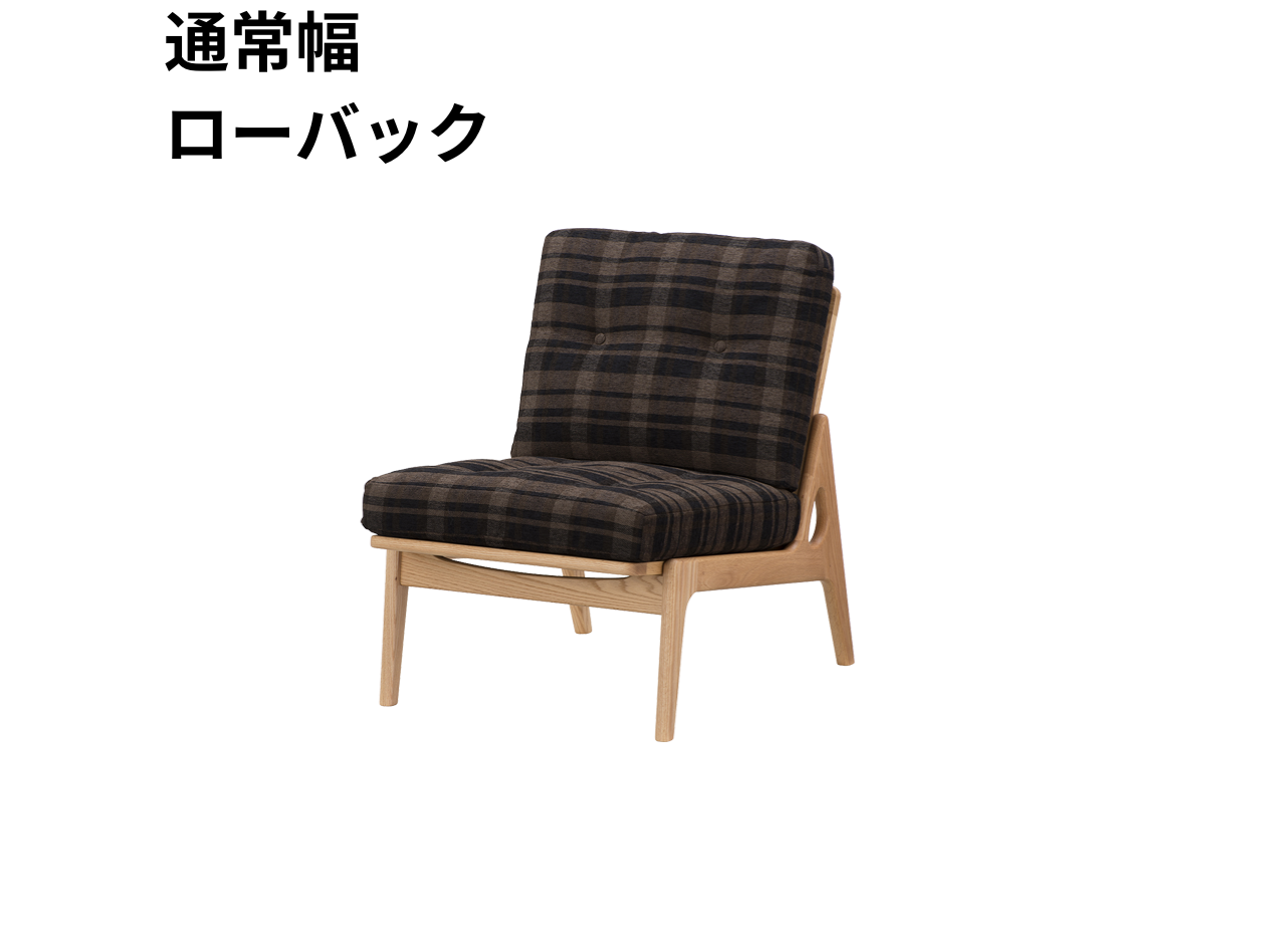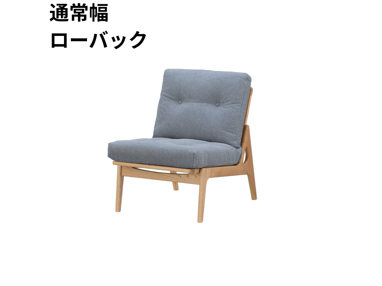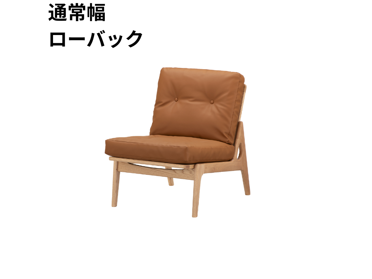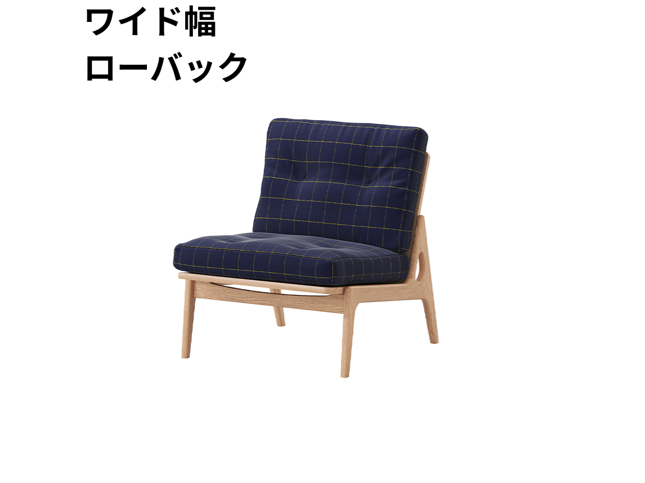 フレームサイズの4パターン。「ハイバック」は通常の高さ仕様(いわゆるローバック)よりも、クッションを約10㎝(背板は約7cm)高くして、安定感のある掛け心地を実現。更によりゆったりと過ごせるよう、幅方向に9cm広げた「ワイド」フレームも新たに加わりました。