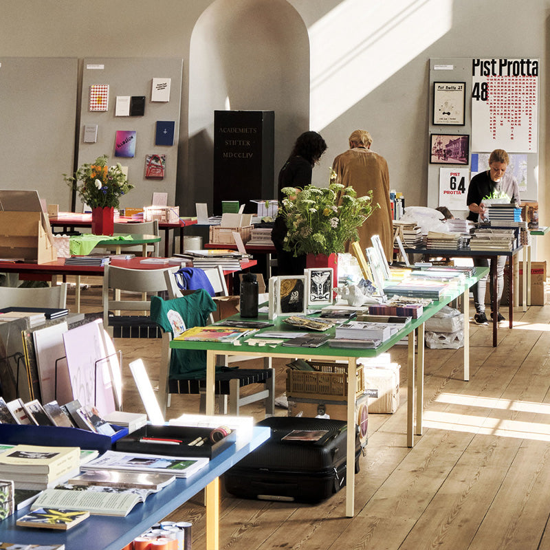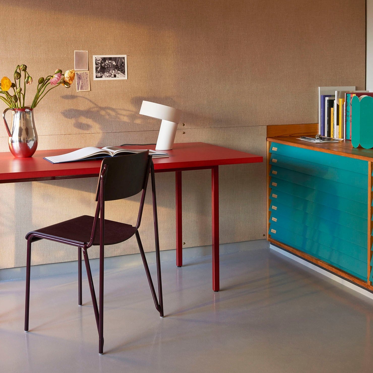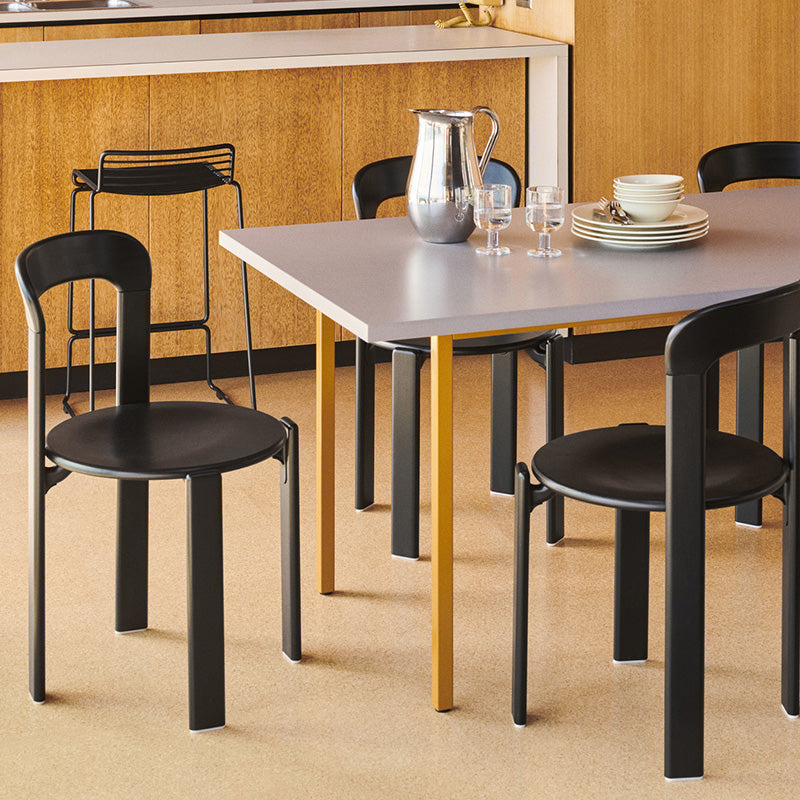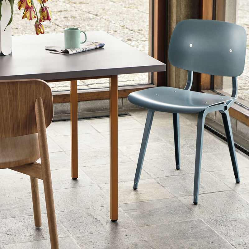頑丈なスチール製の脚と強度のあるバルクロマットMDF天板という、 対照的でありながらも類似する素材を組み合わせている点が特徴です。また、バルクロマットは、中心部まで色が浸透するよう有機塗料で着色した木質繊維から作られており、 表面は滑らかで撥水性があるため汚れが付きにくいこと、FSC認証素材であることなど、 使う人はもちろん、自然環境への配慮まで感じられるプロダクトです。
