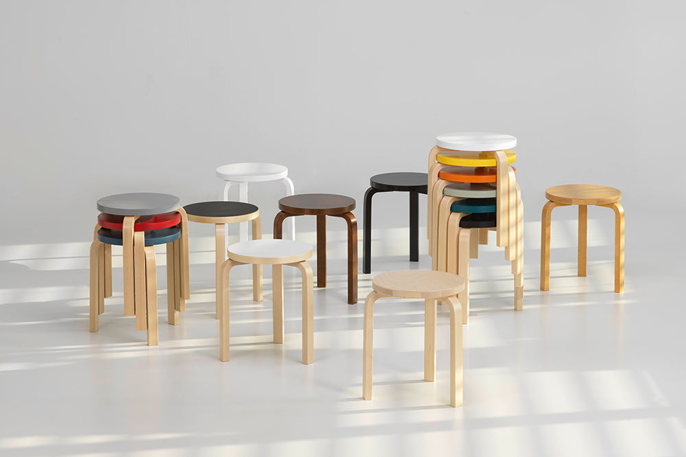 アルヴァ・アアルトによりデザインされた四本脚の「スツール E60」。 三本脚の「スツール 60」同様にスタッキングが可能で、 公共のスペースや教育機関、家庭での使用に適しています。 椅子としてだけでなく、ローテーブルや、インテリアアクセサリーを飾る台としてなど、汎用性があり、円形の座面の裏に、直接脚を取り付けるシンプルな構造です。