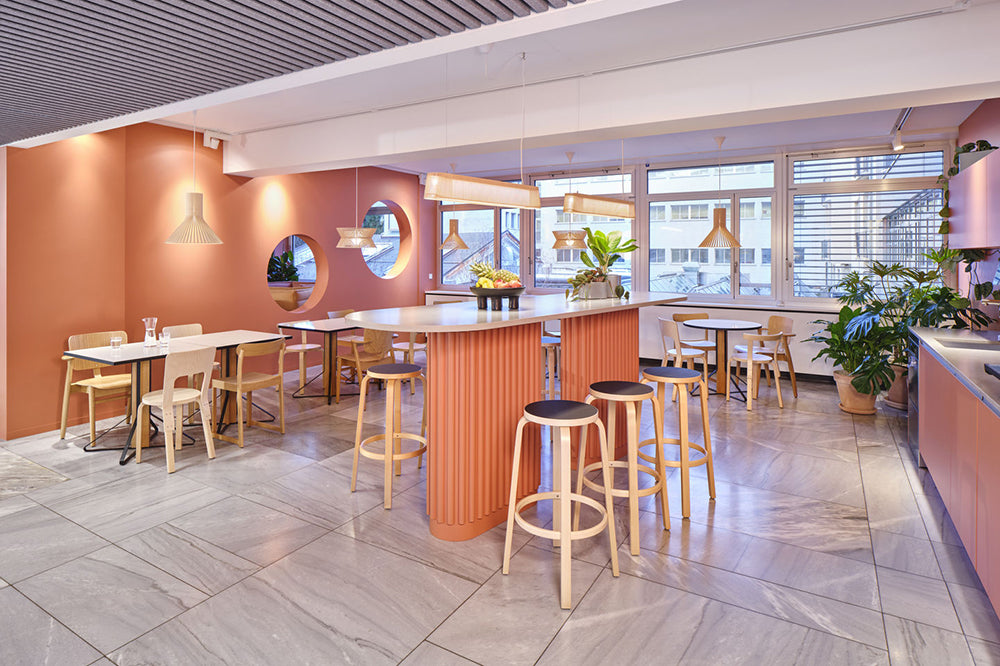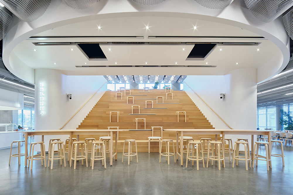 アルヴァ・アアルトのデザインによる「バースツール 64」の前後左右が対称なデザインは、向きを選ばず配置できます。