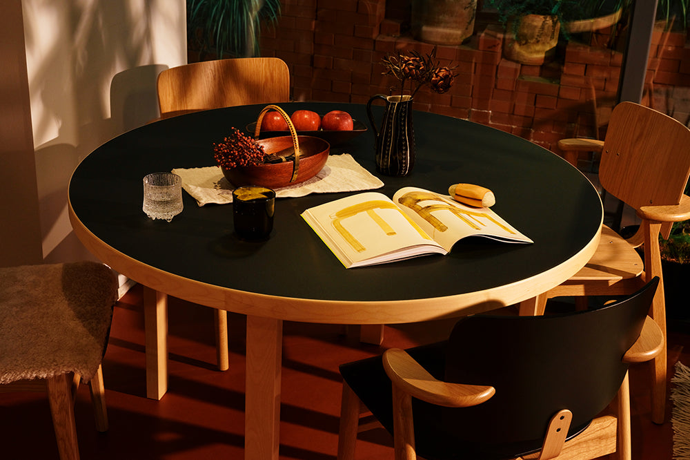 アルヴァ・アアルトがデザインした円形テーブルは、住まいの子供部屋から図書館などの公共空間まで、あらゆる環境や用途に応える高い汎用性があります。自然素材であるフィンランドのバーチ材を用い、ナチュラルラッカー仕上げ、リノリウムやラミネートのバリエーションを揃えた天板は、耐久性に優れ、時の経過とともに美しく変化し、いつまでも使い続けることができます。日々の暮らしの跡が思い出とともに残るリノリウム、傷がつきにくくお手入れが簡単なラミネート、お好みに合わせてお選びいただけます。柔らかくカーブを描く円形テーブルは、食事、仕事、子供の遊びや団らん、用途に合わせて自由自在の使い方ができます。