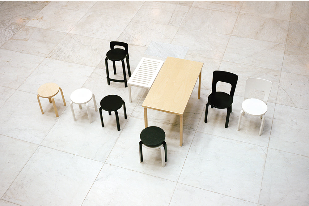 アルヴァ・アアルトが開発した「L-レッグ」シリーズは、複雑な構造や組み立てを必要とせず、座面に直接脚部を取り付けることができます。