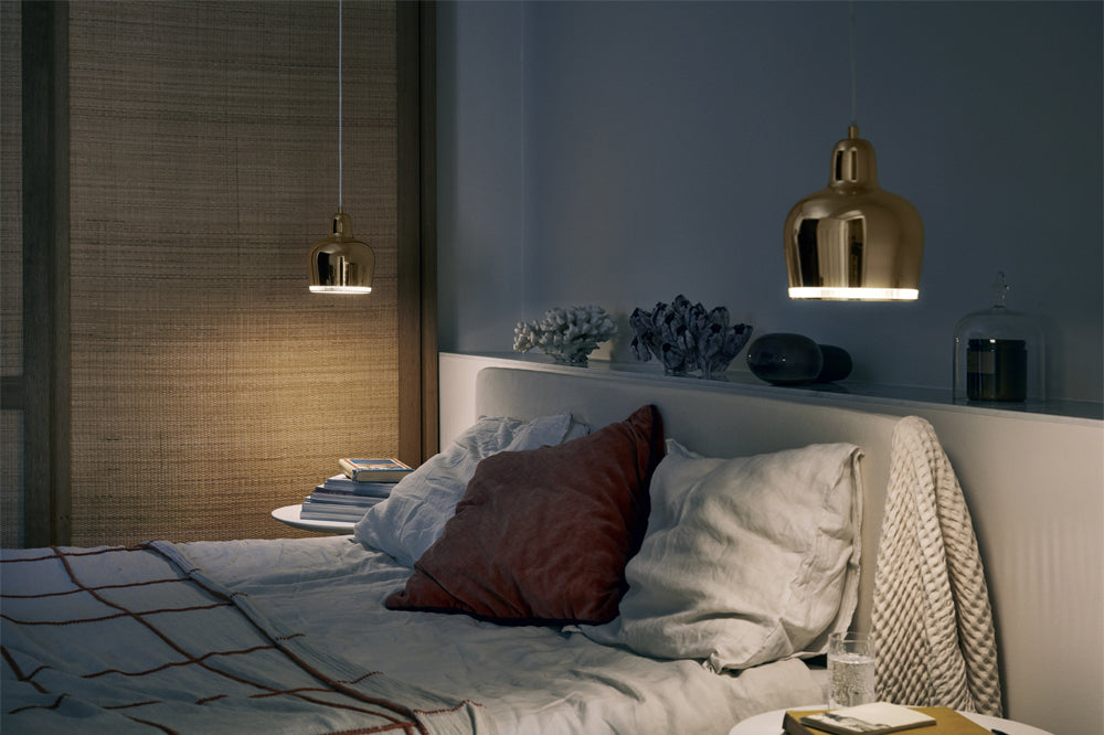「ゴールデンベル」という愛称で親しまれるアルヴァ・アアルトのデザインによるアイコン的ペンダントランプ。その姿は灯りがともっていてもいなくても、まるで彫刻のように美しい佇まいをしています。