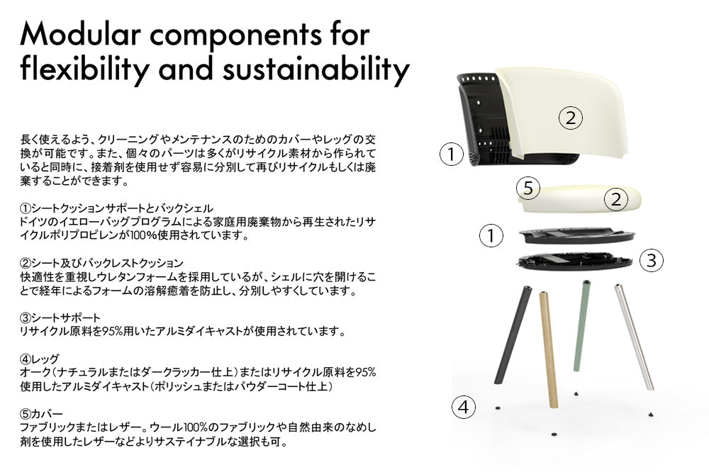 簡単にパーツの変更・分解・分別できる構造造のため、長く使い続けることができます。すべてのパーツが接着剤を一切使用せず取り付けられているため製品寿命を全うした際もパーツ毎に分別し、再びリサイクルまたは廃棄できます。