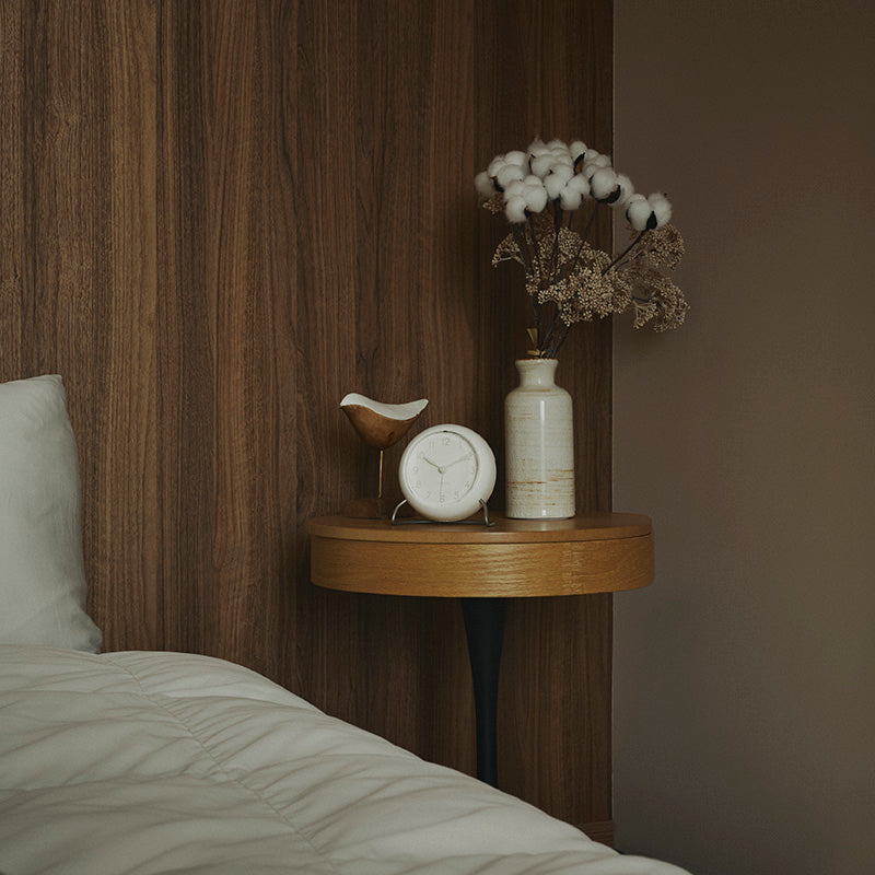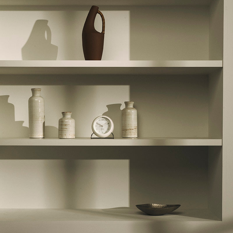スヌーズ機能付きのアラームが内蔵されているので、寝室にもおすすめです。また、無駄のないシンプルなデザインは、様々な空間に溶け込みます。
