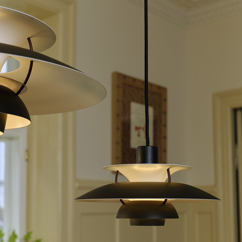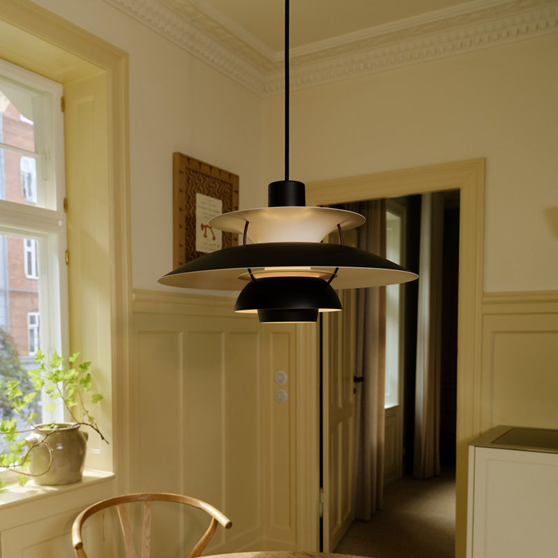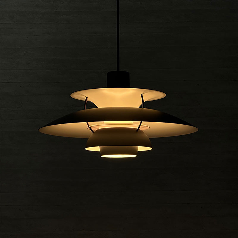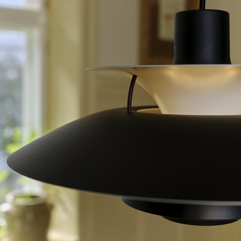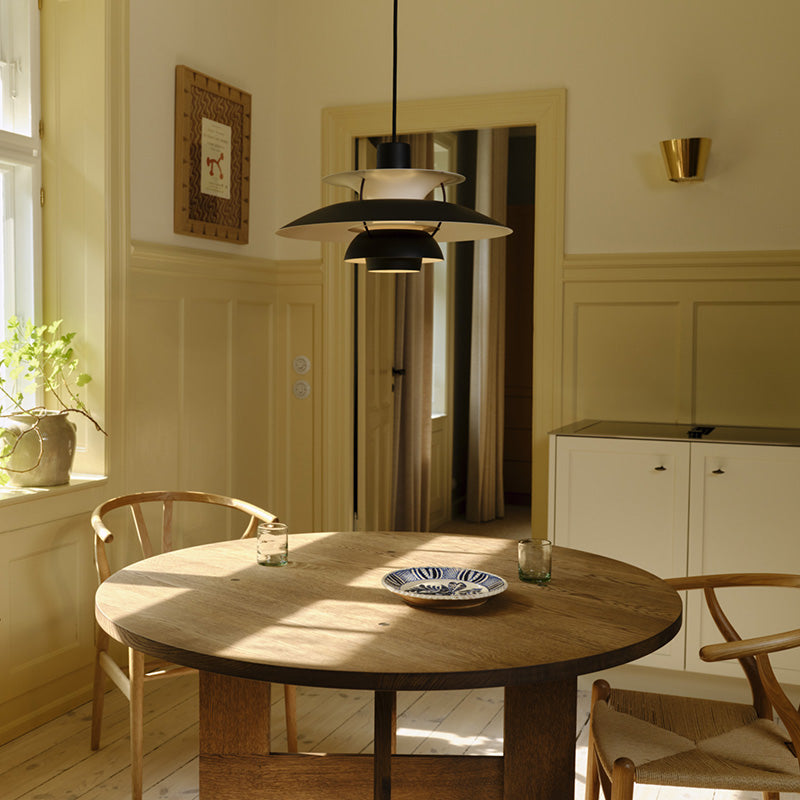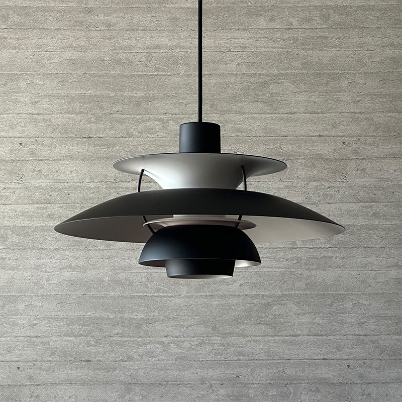 絶えず白熱電球の形状やサイズを変える電球メーカーへの挑戦として、ポール・ヘニングセンは1958年にPH 5を開発。ペンダントのメインシェードのサイズ(直径50cm)にちなんで命名されました。このアイコニックなデザインは、ヘニングセンの3枚シェードシステムと同じ原理に基づいており、柔らかく心地よい光でまぶしさをまったく感じさせないため、ダイニングのテーブルランプとして最適です。