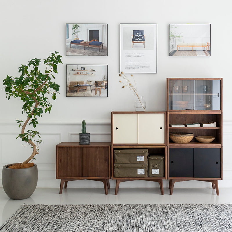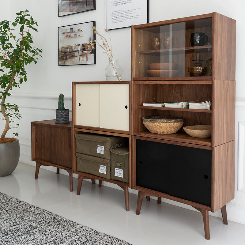 扉の付いていないオープンシェルフ、扉を取り付けるための溝付きのオープンシェルフ、そこに取り付ける木製ドア・ガラスドア・MDF素材のカラードア。そして、棚板や脚組を追加して自由な組み合わせをお楽しみいただけます。お部屋のイメージに合う組み合わせをぜひ見つけてください。