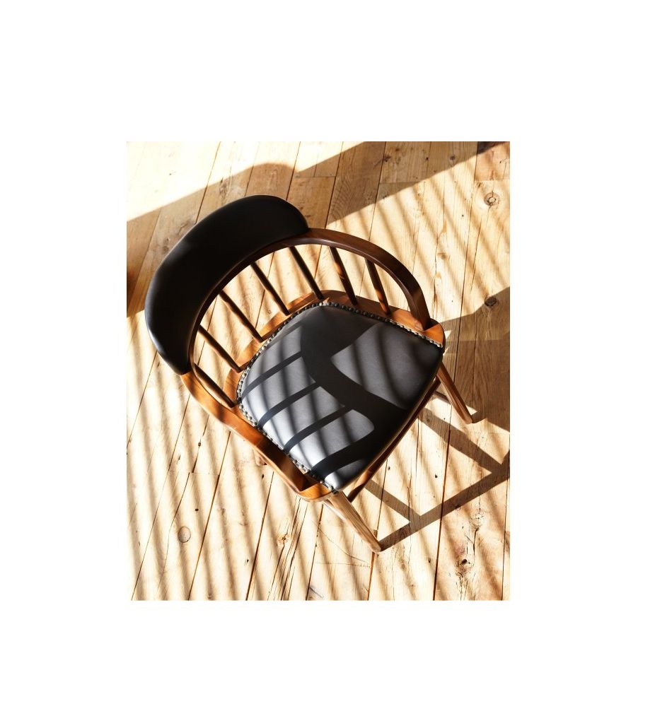 オリジナは背、座面ともにウッドですが、こちらはクッション性を持たせるために背と座にウレタンを入れ、長時間座っても疲れないようにしています。ヴィンテージの美しいプロポーションを崩さずにサイズ変更をおこない、かつACMEのダイニングテーブルすべてに収まりが良いようアームの高さと幅を調整しました。