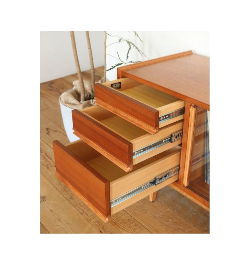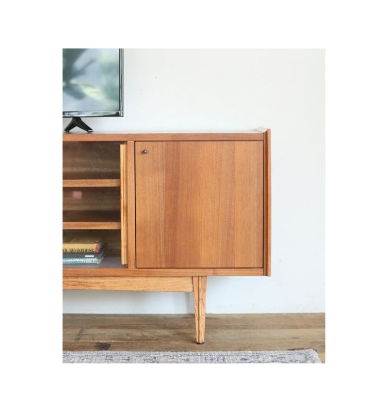 天板から飛び出している側板や脚、幕板など、ヴィンテージに見られるデザインを至る所に盛り込んだ存在感抜群のTVボードです。