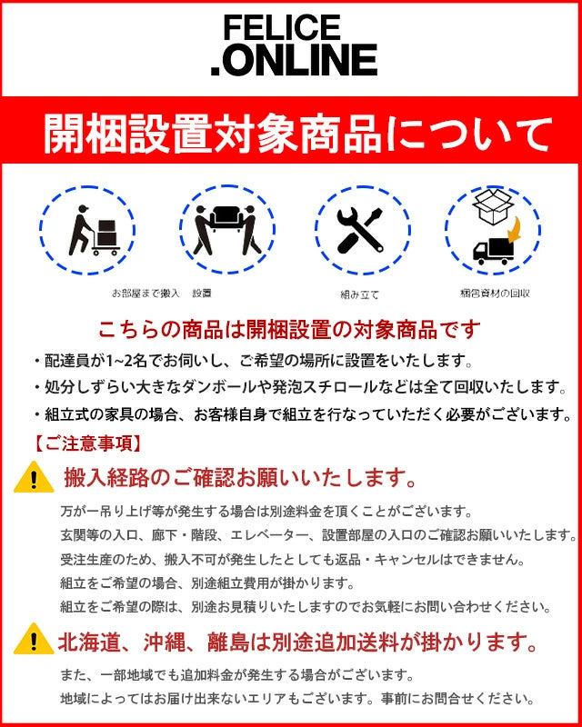 ・メーカー休業日(年末年始、GW等大型連休、お盆期間中等)や、引っ越しシーズン等、配送繁忙期には上記ご案内日数よりお時間を頂戴する場合がございます。
