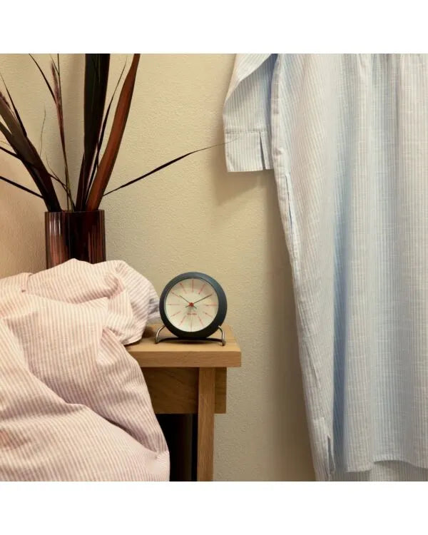 アルネ・ヤコブセンのテーブルクロック(置き時計)は、アラーム、スヌーズ機能、そして時計上部のタッチセンサーによって作動するライト機能を備えています。とても美しく、シンプルでクラシックな目覚まし時計です。