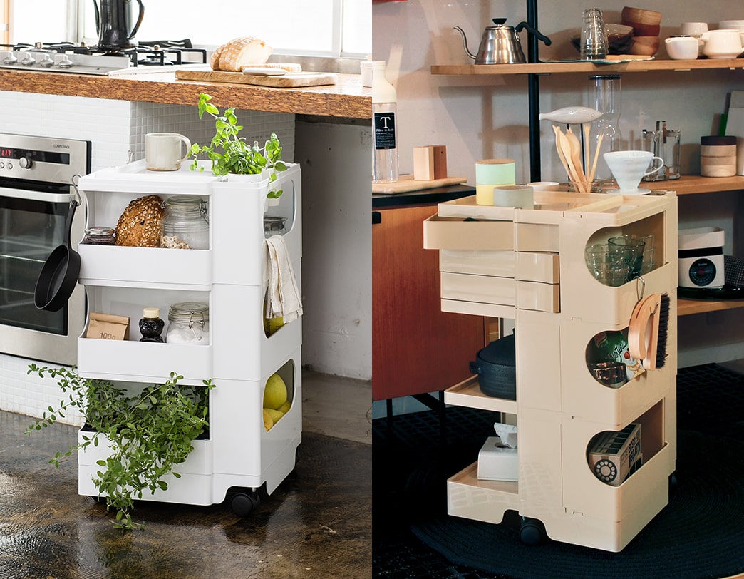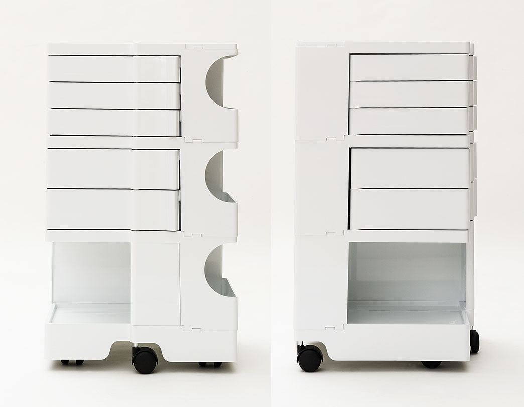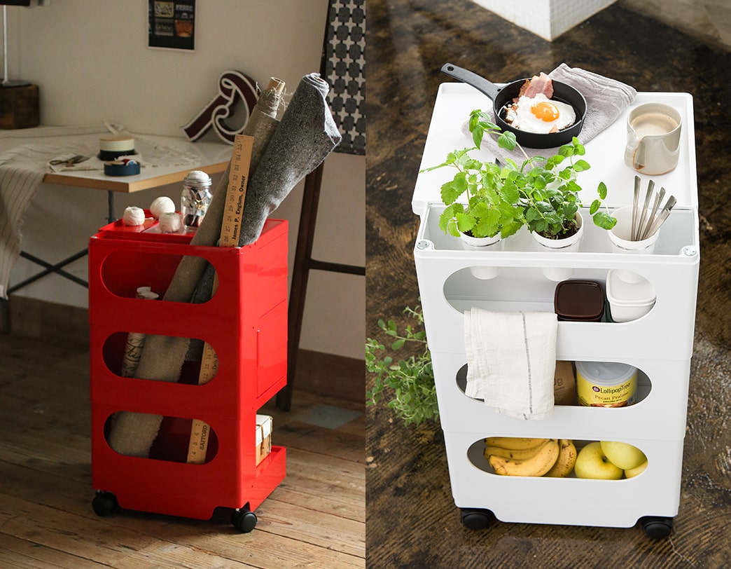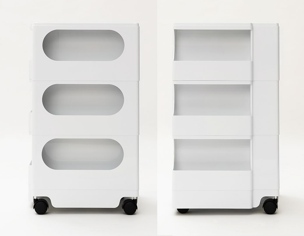 ボビーワゴンは、キャスター付きの本体を回転させることで側面4面すべてを効率的に使える、デザイン性と機能性に優れた収納家具です。