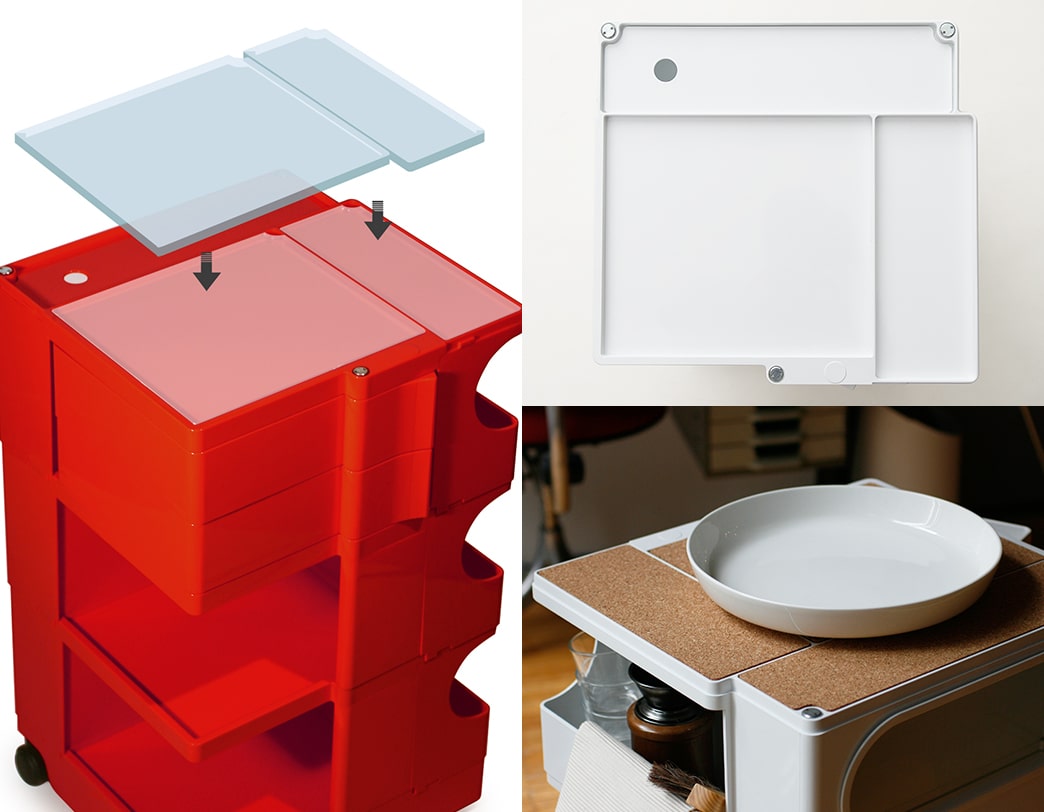 ボビーワゴン正規取扱店のみ、すべてのボビーワゴンに1点ずつ専用インナートレイが付属しています。市販のトレイでは実現できなかった、ぴったり感がうれしいボビーワゴン専用のトレイです。
