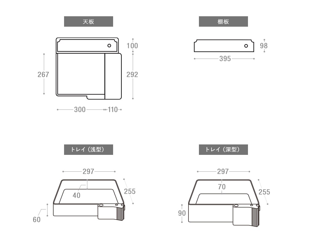 2種類のトレイ: 深さが約40mmの浅いトレイと、約70mmの深いトレイの2種類があります。大きさはA4用紙(210×297mm)が収まる大きさです。