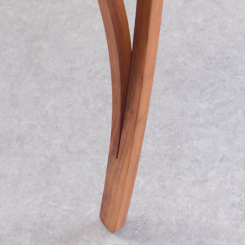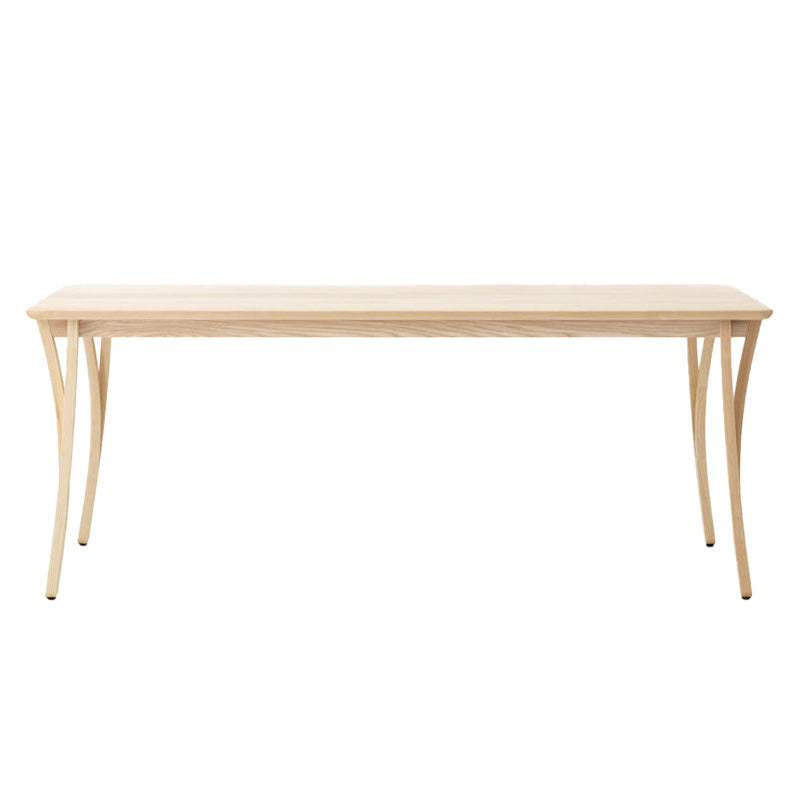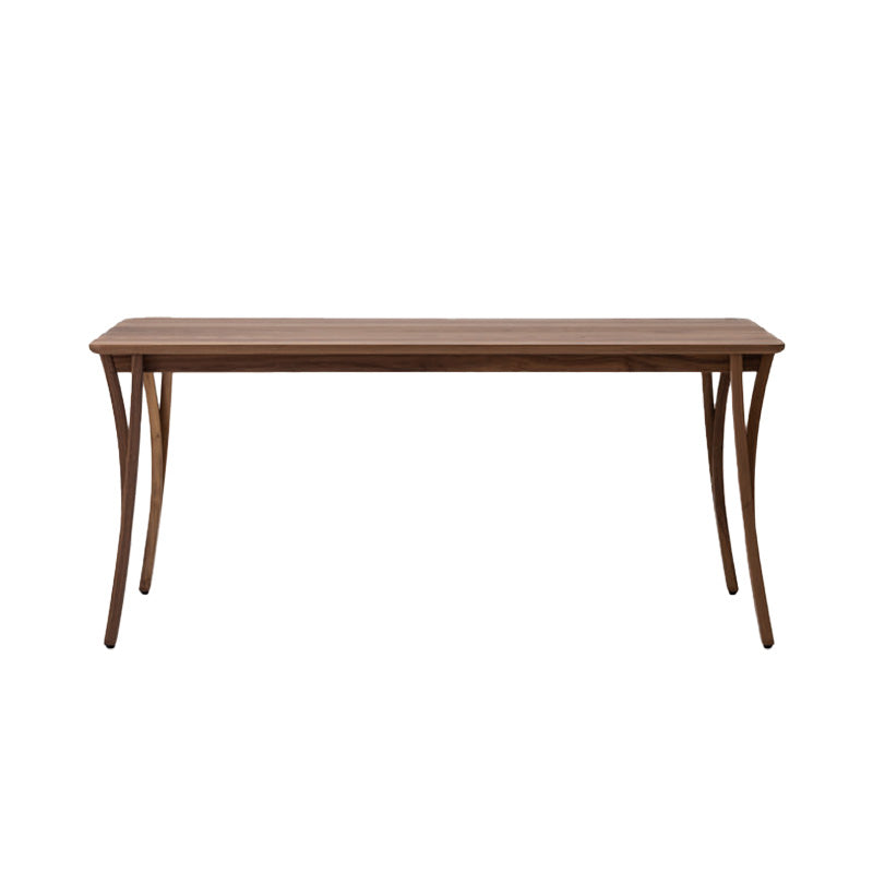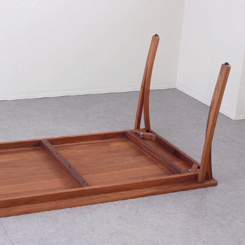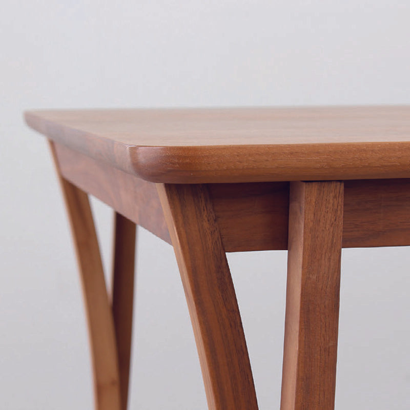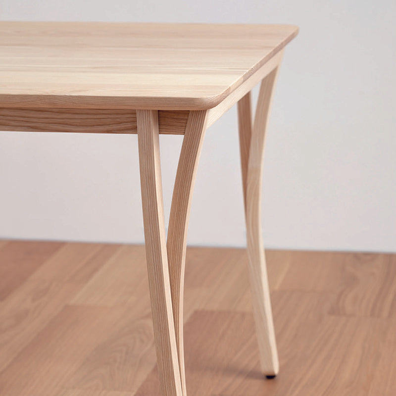 曲木の技を活かし、一本の無垢の脚が枝分かれし、天板を支えるテーブルです。27ミリ厚の細い脚は枝分かれして幕板と三角構造を形成し、100ミリ幅の材と同等の強度を持ちます。脚と天板との取り合いにこだわり、ノックダウン式に見えない意匠です。