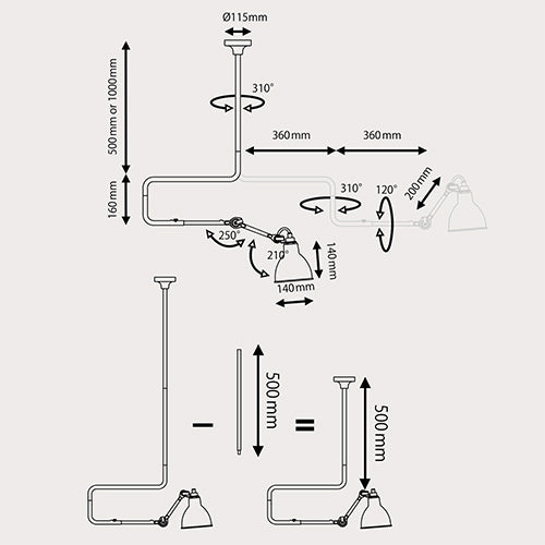 フレキシブルなジョイントアームにより、シェードの位置を簡単に調整できるシーリングライトです。又、設置の際に、天井の高さに合わせ、バーの長さを500mm又は、1000mmを選ぶことが可能です。1921年フランスのデザイナー、ベルナール・アルビン・グラは、アトリエやオフィス向けに、堅牢かつシンプルなランプを設計しました。彼の名をとって”Gras Lamp”と呼ばれたこの一連の照明器具は、基本構造にネジや溶接を一切使用しない独自の構造を備え、特にアーム、柄、ブラケット、ベースのデザインそしてディテールは全く独創的であり、その時代を超える革新的なものでした。1927年に特許は、RAVEL社に買い取られ「GRAS」lampとして製造が始まりました。いち早く、そのモダンさと革新的なデザインに魅了された建築家、ル・コルビュジエは、自身のアトリエでこのランプを採用しました。”Gras Lamp”は照明器具の歴史の中で、プロフェッショナルと住環境との両方に取り入れられた最初のデザインとなりました。2008年、この「GRAS」lampの再生の権利を3人の熱心な支持者が獲得、DCW社を設立し、”Gras Lamp”の全ての点に関してオリジナルに忠実に再現し生産をしています。