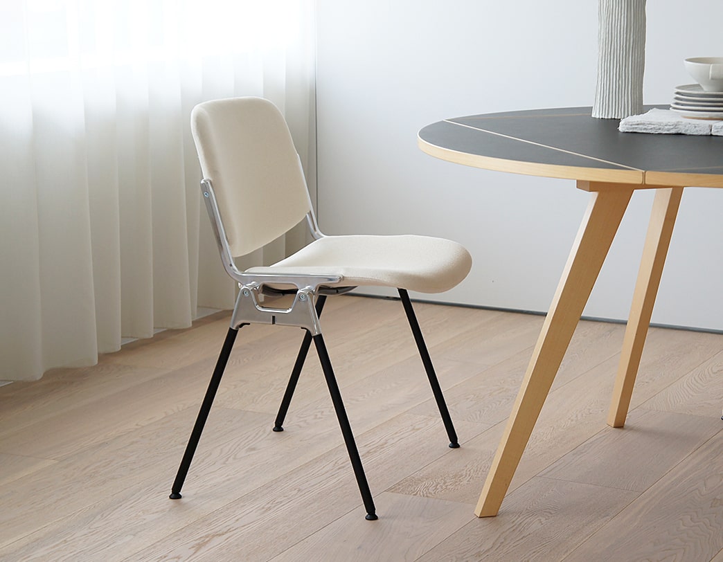 木素材の椅子が主流の時代に、成型合板の座面・背面をアルミニウム製のフレームで挟み込み、ネジで締め上げて固定する構造が生み出されました。