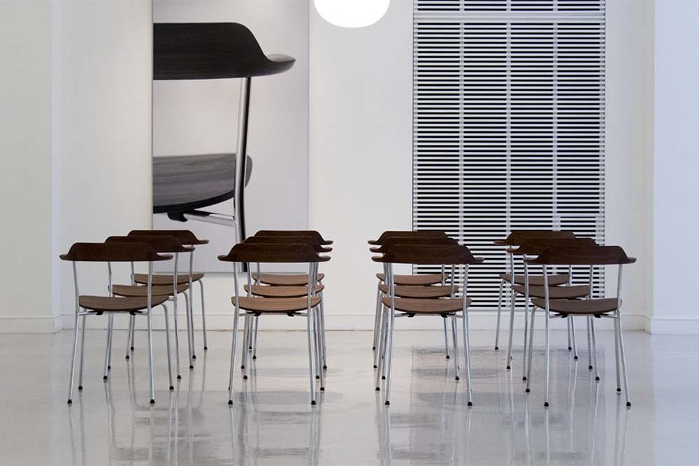 その完成されたフォルムは、チェアを積み重ねたり並べたり、複数脚集まった姿にも一体感が生まれるようにデザインされています。
