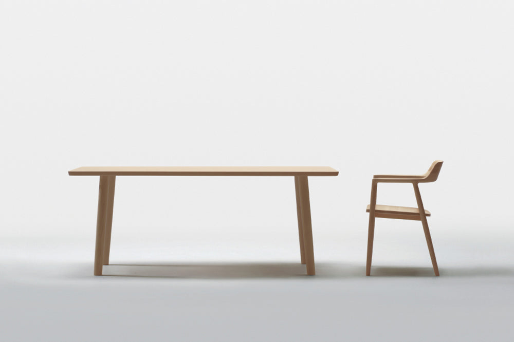 縁をやや斜めにそぎ落した輪郭は、天板のフォルムを浮き立たせHIROSHIMAシリーズの他アイテムに通じる美しいシルエットをつくっています。天板と4本の脚でつくられたシンプルな構造で、テーブル下の空間を広く使えることも魅力の一つ。ひじ掛けがついたHIROSHIMAアームチェアもテーブル下におさめることができます。