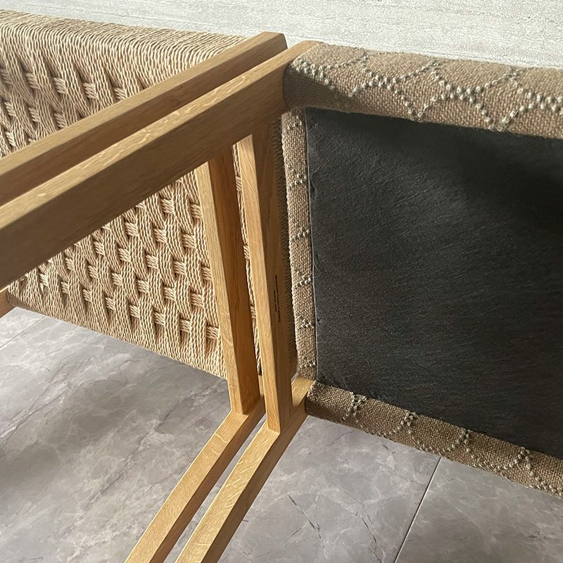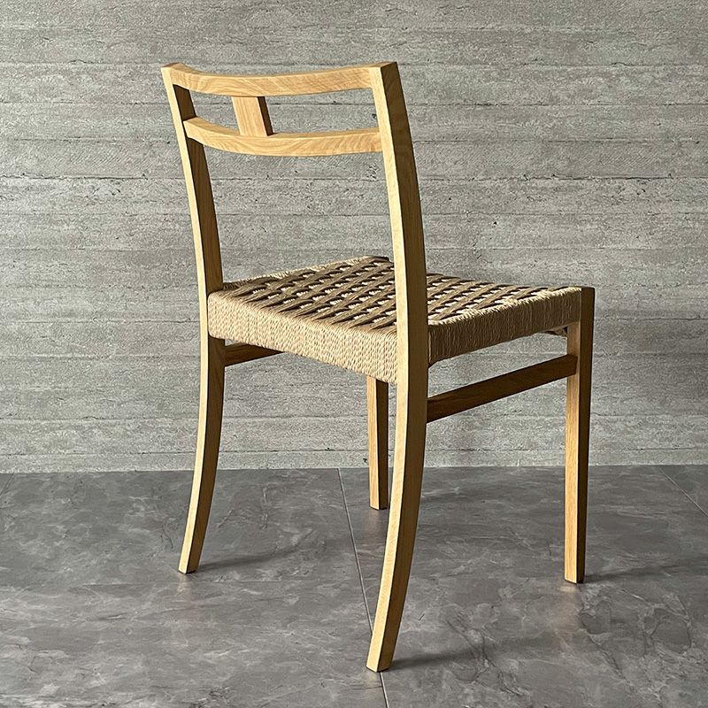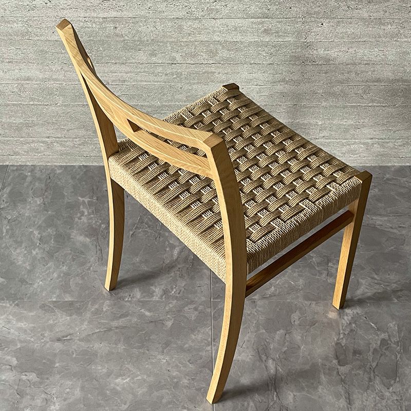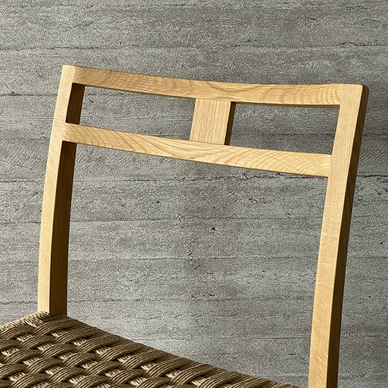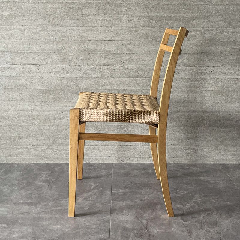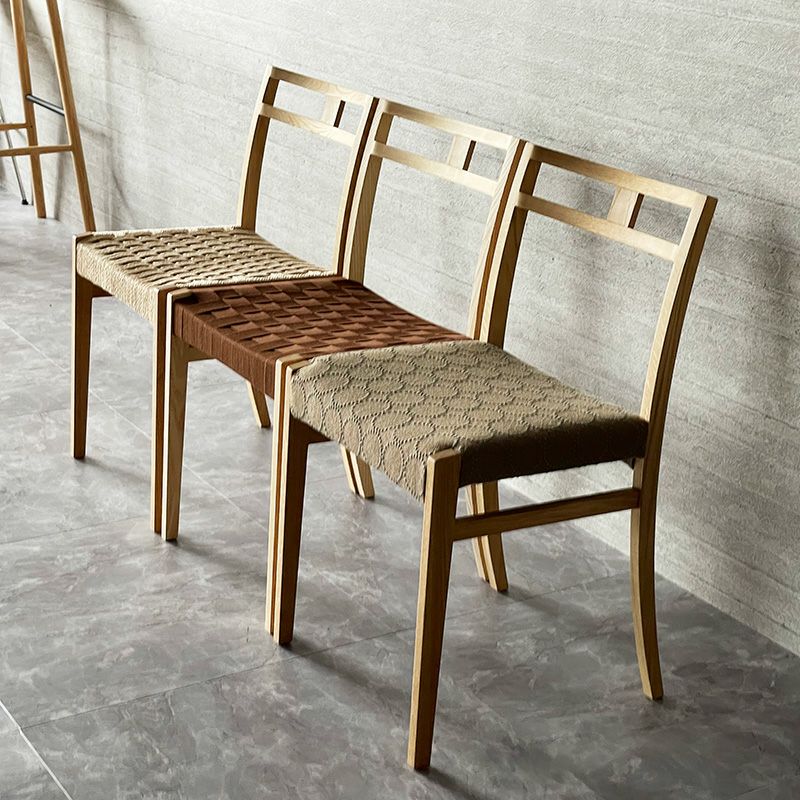 座面はぺーパーコード巻、アクリルテープ巻、ファブリック張込から選べます。樹種や張地にもよりますが、椅子の重量は約3kg前後と比較的軽い部類の椅子に仕上がっています。