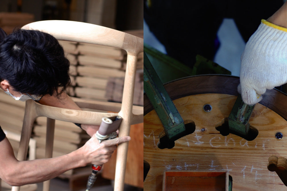 また、綺麗な継ぎ目の構造にも試行錯誤しました。薄い材を使っているので、割れが起きたり糊のはみ出しが起きないように、前後貫の逃がし方にも工夫が施されています。これまで村澤氏デザインの作風は、代表作PePeチェアのように丸っぽくフィンガージョイントでつなげるものが多かったですが、改めて「木と木が出会う場所の刺激が大切」という気づきもありました。