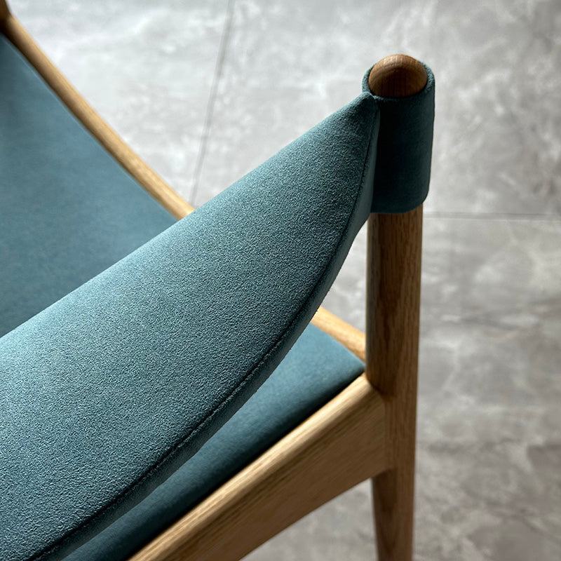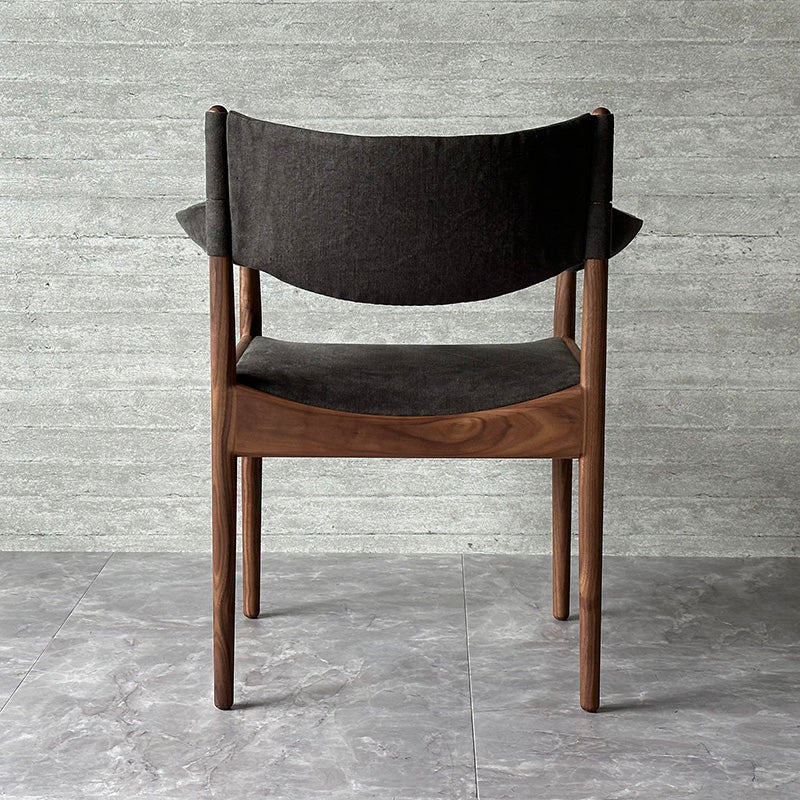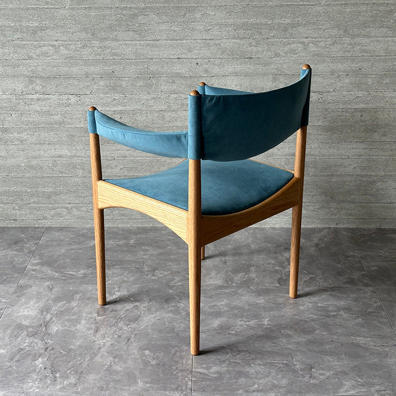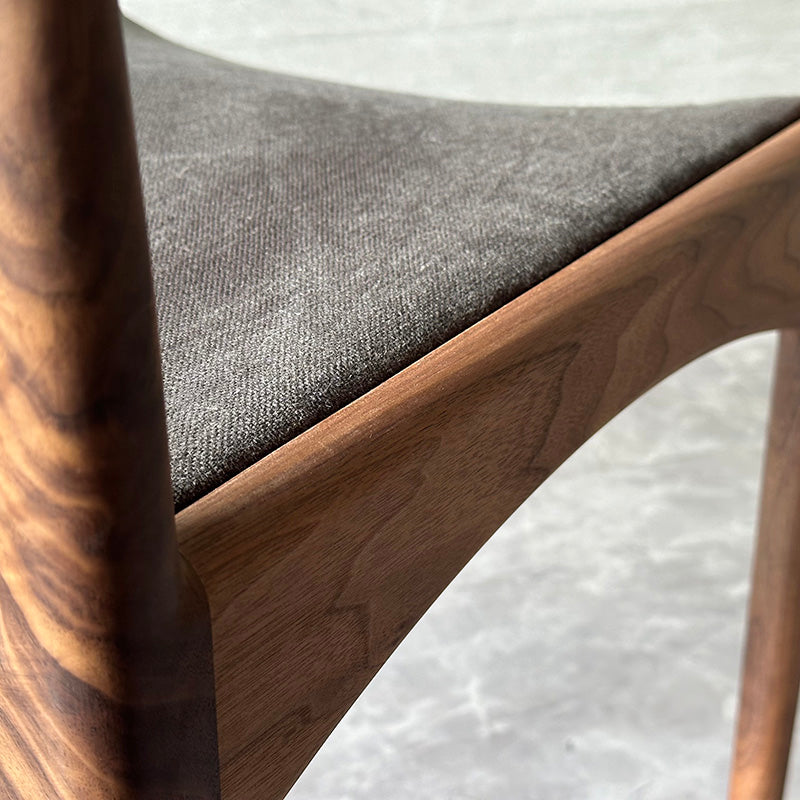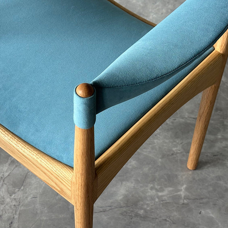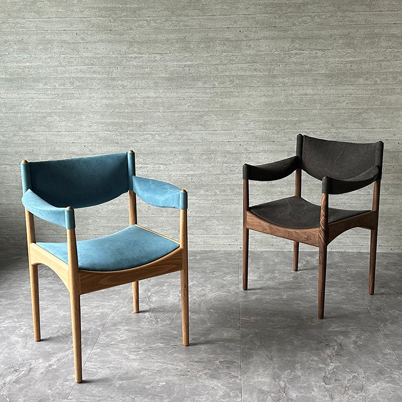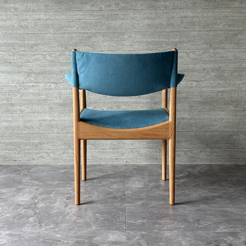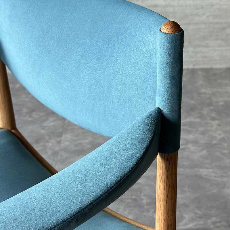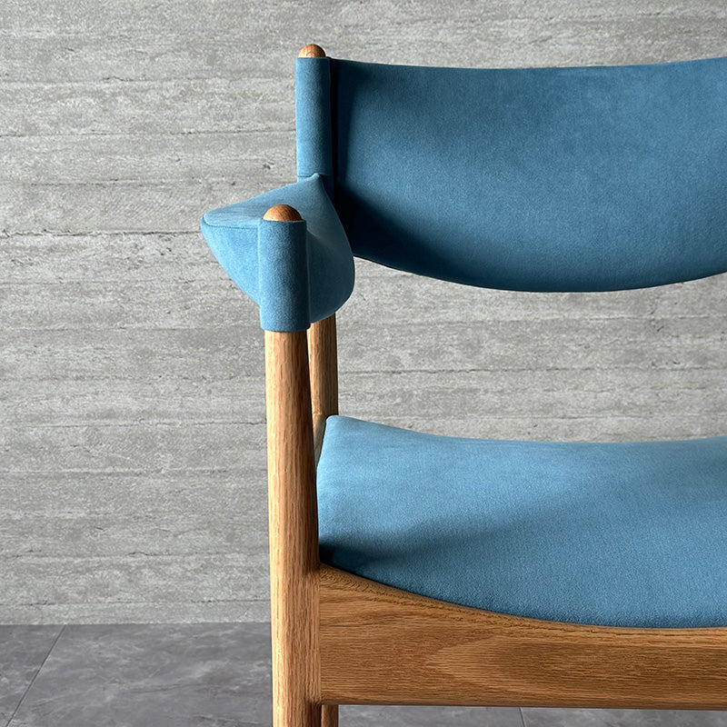 直線と曲線を組み合わせた幾何学的なデザインが特徴。特に、座枠は前後と左右でアーチが反転しており、これを木材で正確に再現するのは高度な木工技術を要します。また、アームは美しい曲線を描きながら、強度を保つために複雑な形状をしています。試行錯誤しながら、技術を駆使することで、細身ながらも十分な強度を確保することに成功しています。