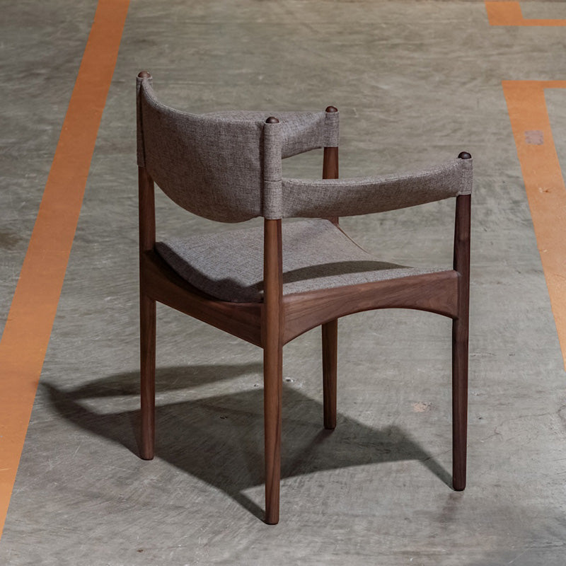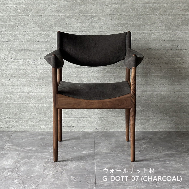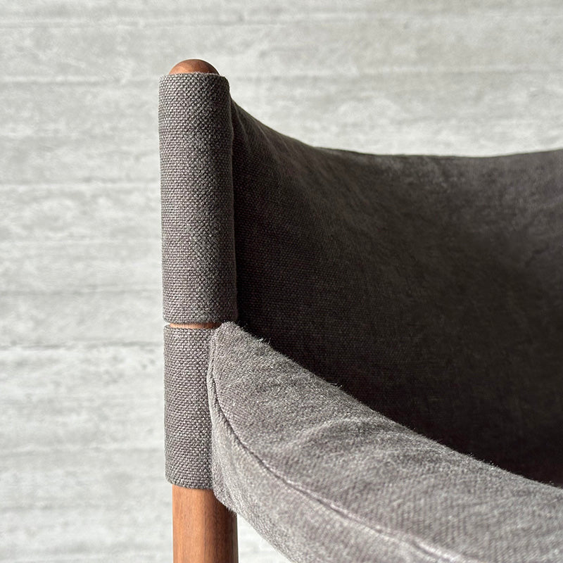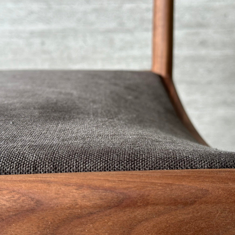 同シリーズのソファと同様にスクエアなデザインですが、座枠は前後と左右のアーチ形状を反転させ、幾何学的な形状を生み出しています。
