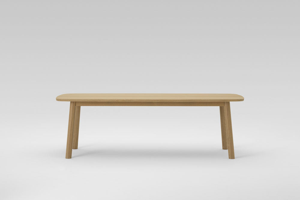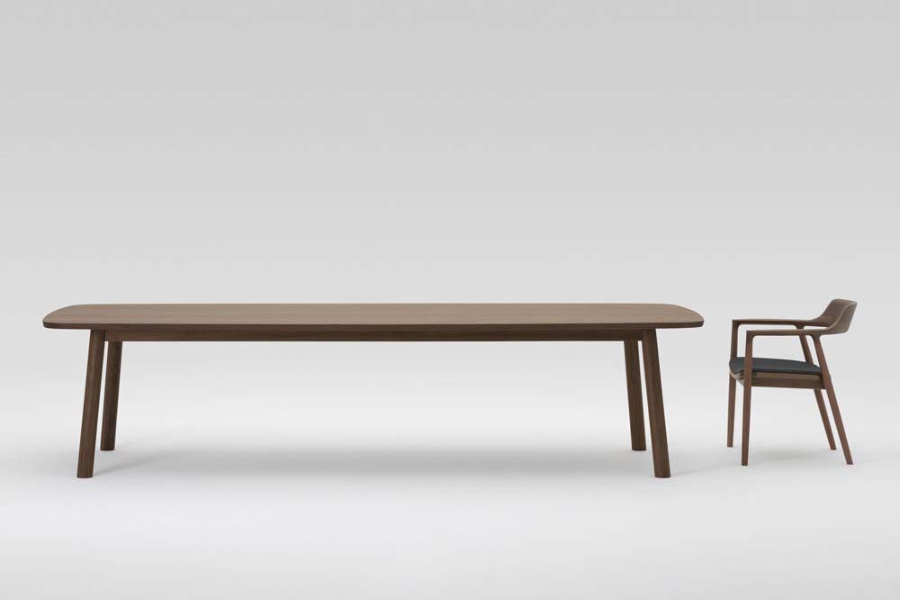 穏やかなカーブを描いた無垢天板のテーブルシリーズです。天板の縁はやや斜めに削ぎ落とされ、天板のかたちを浮き立たせています。最大3.2mまである広々とした天板はどの椅子と合わせても調和がとれ、空間をやわらかな雰囲気に包みこみます。木のもつ豊かな表情と、使い込むほどに生まれる味わいを感じられるのも魅力の一つ。ダイニングテーブルとしてだけでなく、会議机やパブリックの場面にもよく似合う汎用性の高いテーブルです。