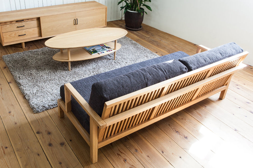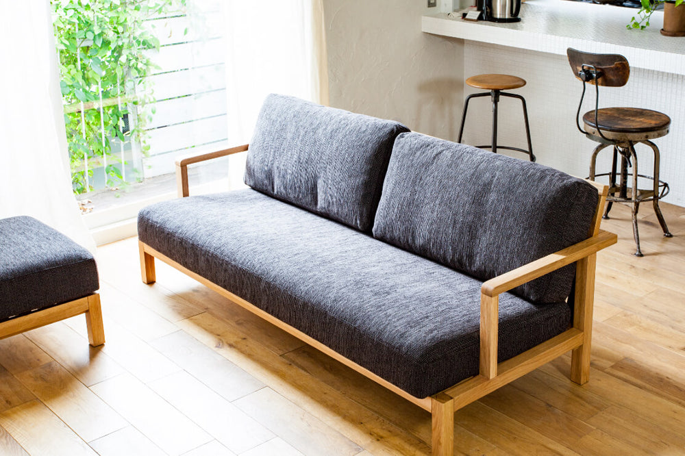 木フレームの背の角度や、座面クッションの傾斜、背クッションのボリュームによって、身体を預ける最適な角度を計算しています。また4層の異なる弾力のウレタン材を重ねることで身体をやさしく包み、それでいてコシのある心地を与えます。