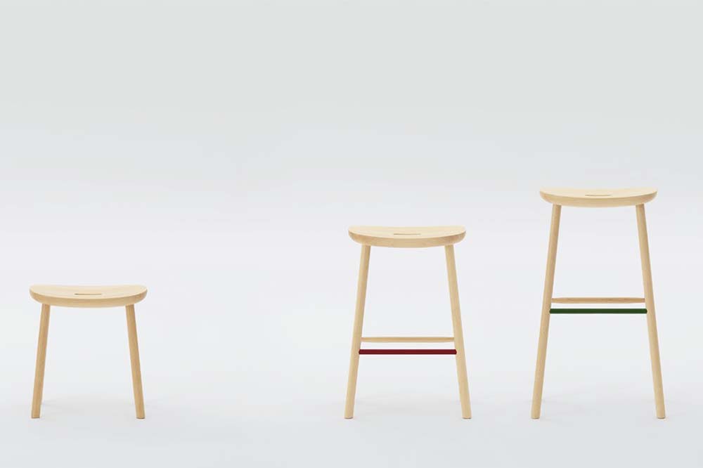 座面高さが異なる3サイズ展開。一般的な座面高さ431mmのO1スツールの他に、アクセントカラー(ブラック・グリーン・レッド)のついたスチール製のフットレストをつけた座面高さ640mmのO2スツールMid(ミドル)と、座面高さ780mmのO3スツールHigh(ハイ)があります。木との異なる素材感でのコントラストを引き立て、親しみやすさと新鮮さを与えています。