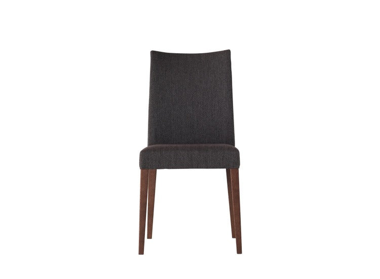 張りのチェアながら、日進木工らしいすっきりとシャープな印象になるよう背のラインや脚の形ににこだわりました。オプションとして背に椅子をひく際の手掛けをとりつけることが可能です。