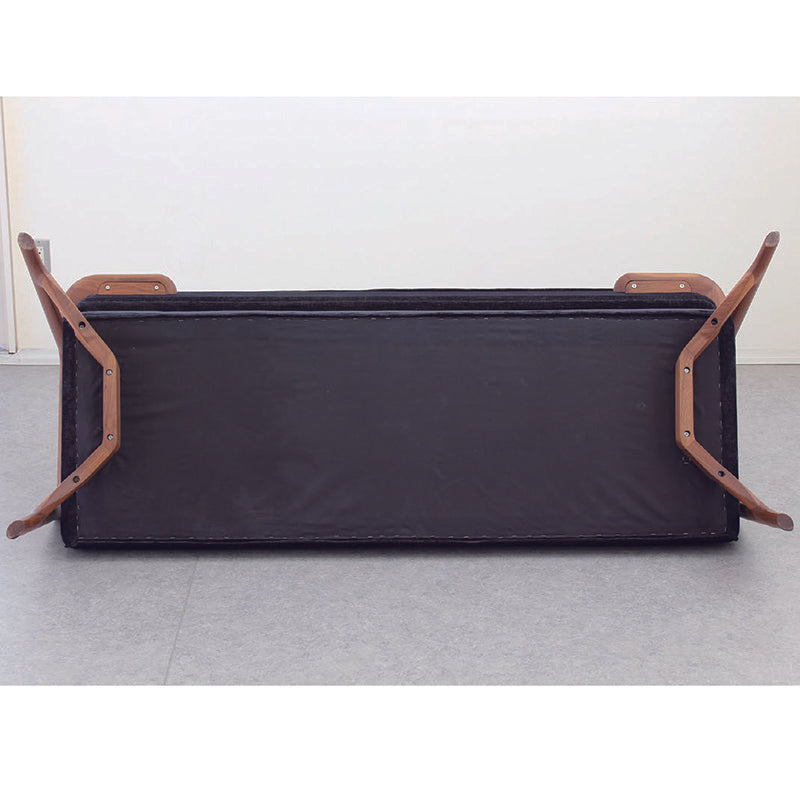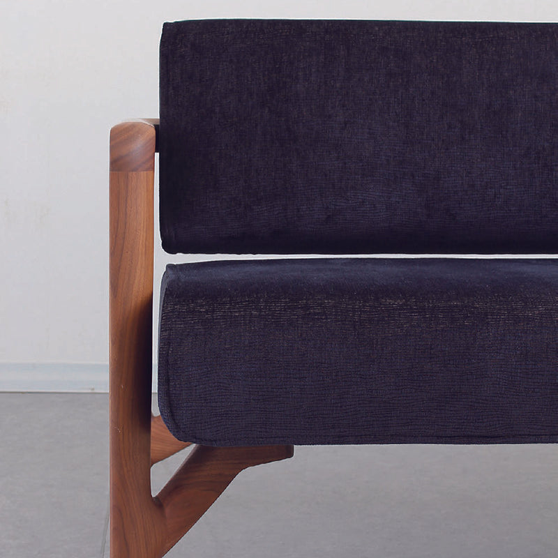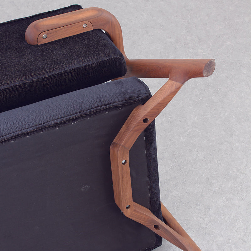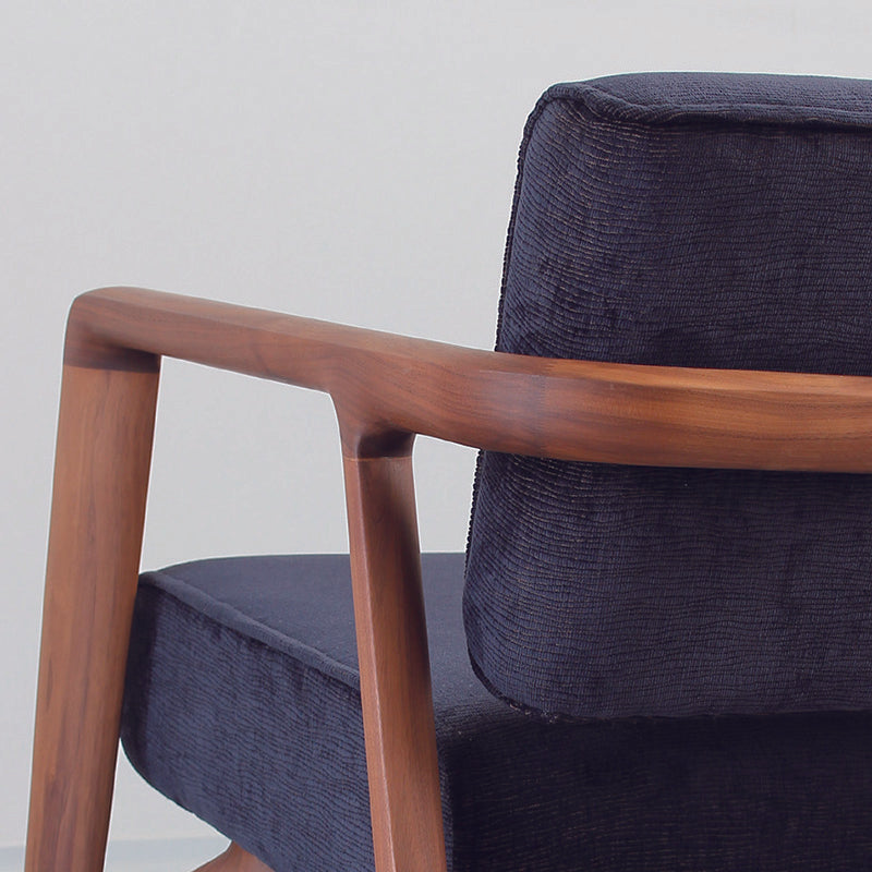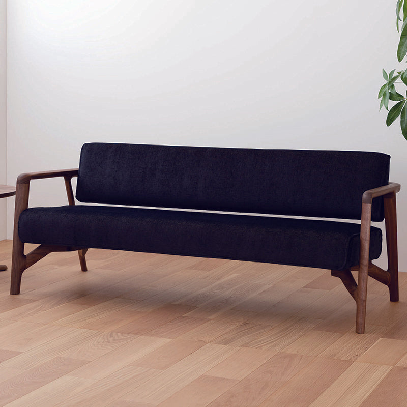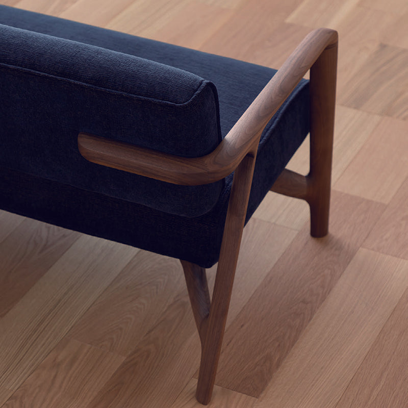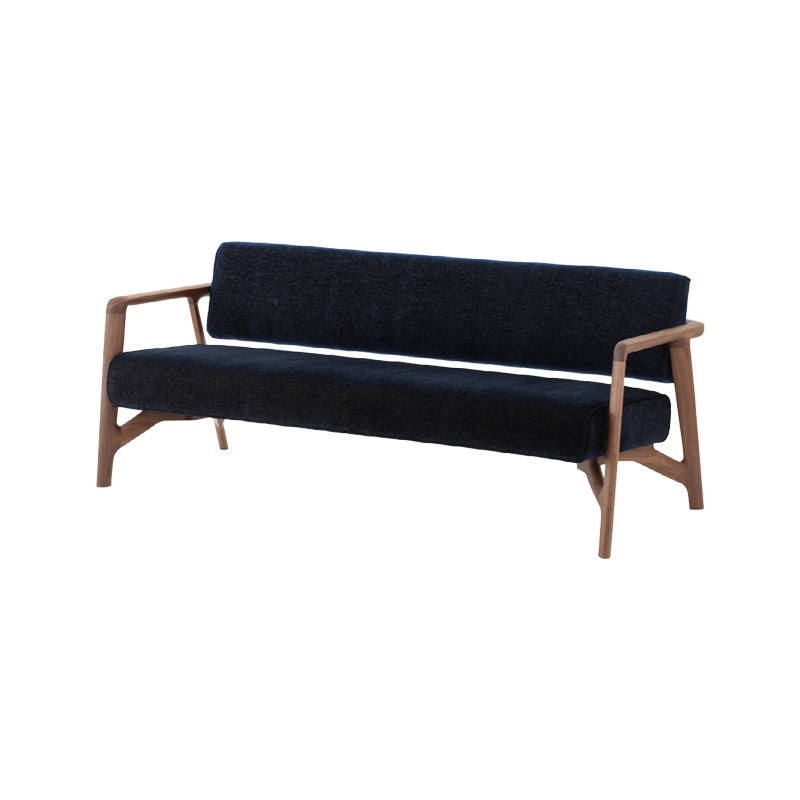 斜めに振られた脚は見る角度によって薄く見えたり、幅広く見えたりと厚みを変え、全体の表情を豊かにしています。背クッションはアームから保持されていますが、通常の視線では金具などは見えません。