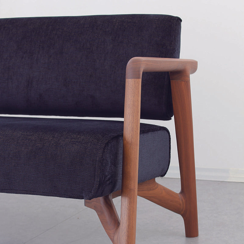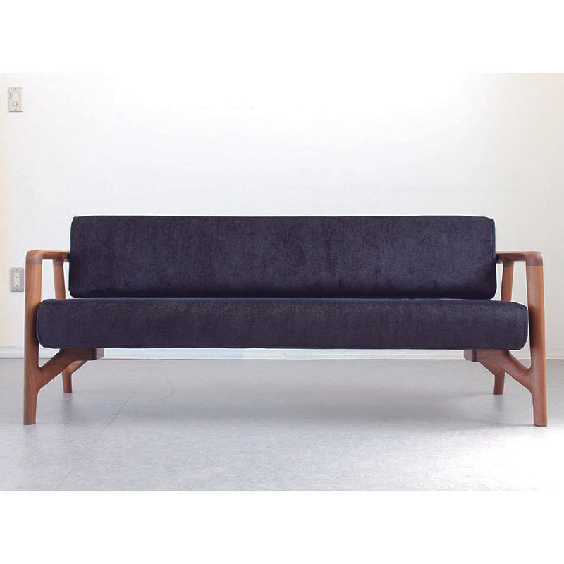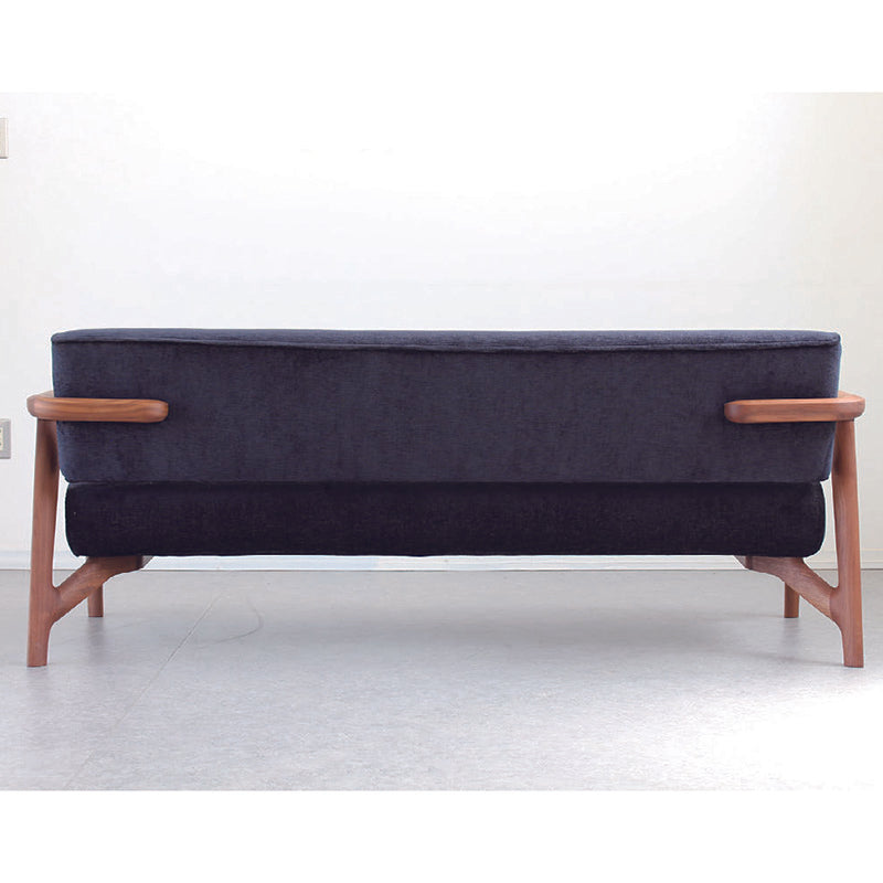 木の葉型の脚の断面がアームから背へと緩やかに繋がるソファです。斜めに振られた脚は見る角度によって厚みを変えます。左右に分離されたフレームは座と背に浮遊感を与え、背面からも美しい意匠を作り出しています。
