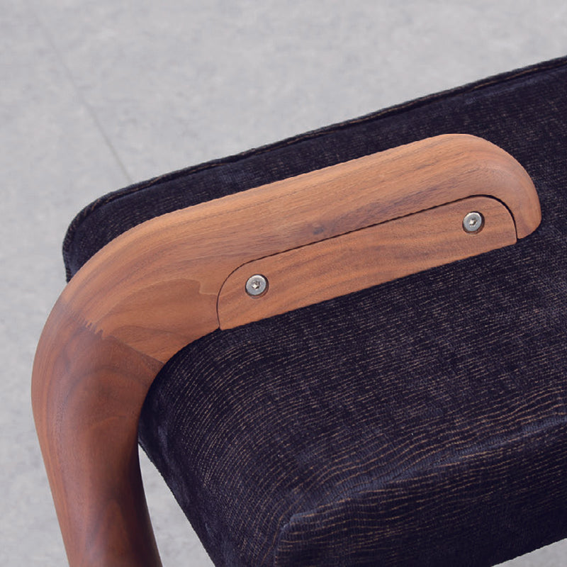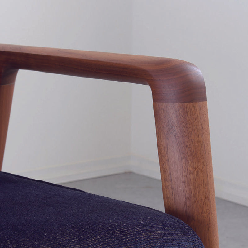 座は前後の脚をつなぐ貫に乗って脚から離れているため、浮遊感があります。木の葉型の脚の断面は座枠へも緩やかに繋がり、座面が浮いているような印象をもたらし、全体のフォルムを優雅にしています。