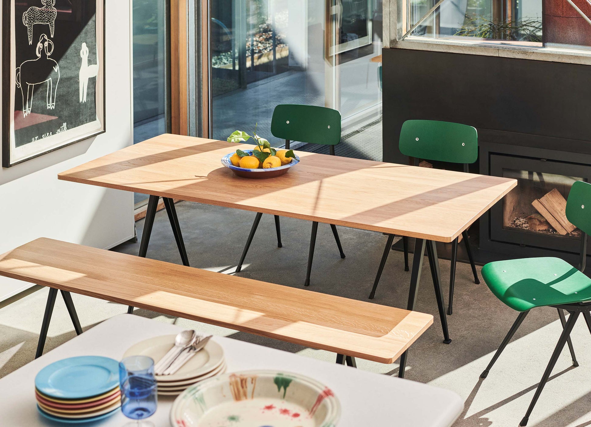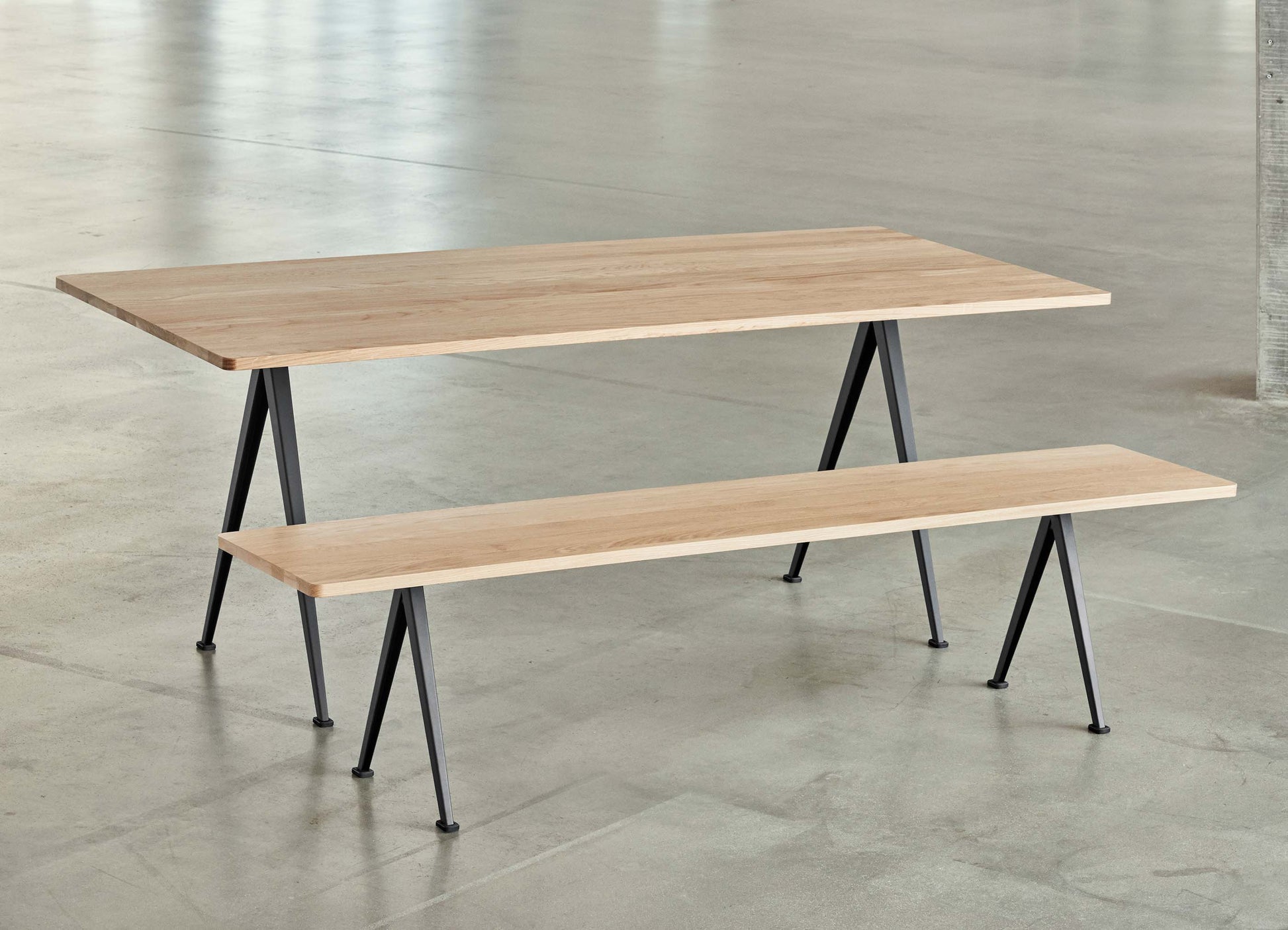 機能的で軽く、頑丈に設計されたPYRAMID BENCHは、オーク材のトップと薄いスチール板のベースを備えています。