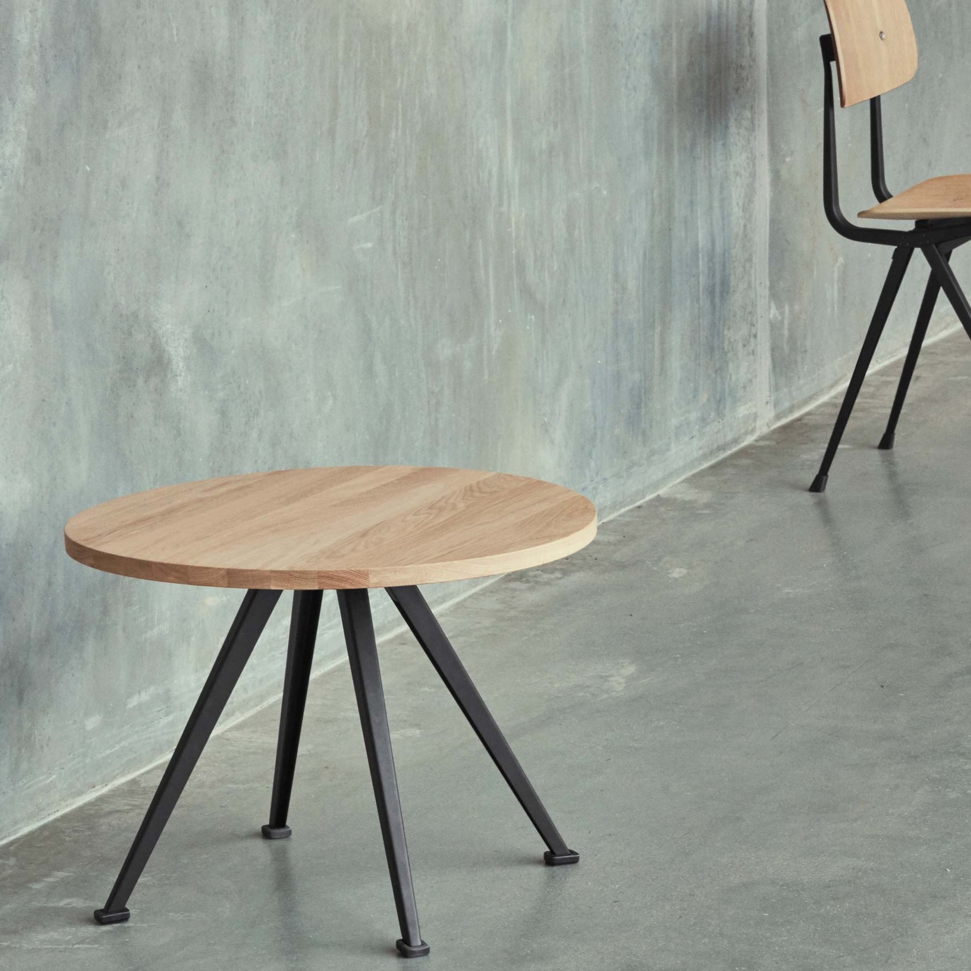 機能的で軽く、丈夫に設計されたPYRAMID COFFEE TABLEは、オーク材のラウンドテーブルトップと外側に傾斜した薄いスチール板の脚を持ち、機能的ですっきりした表現を生み出しています。