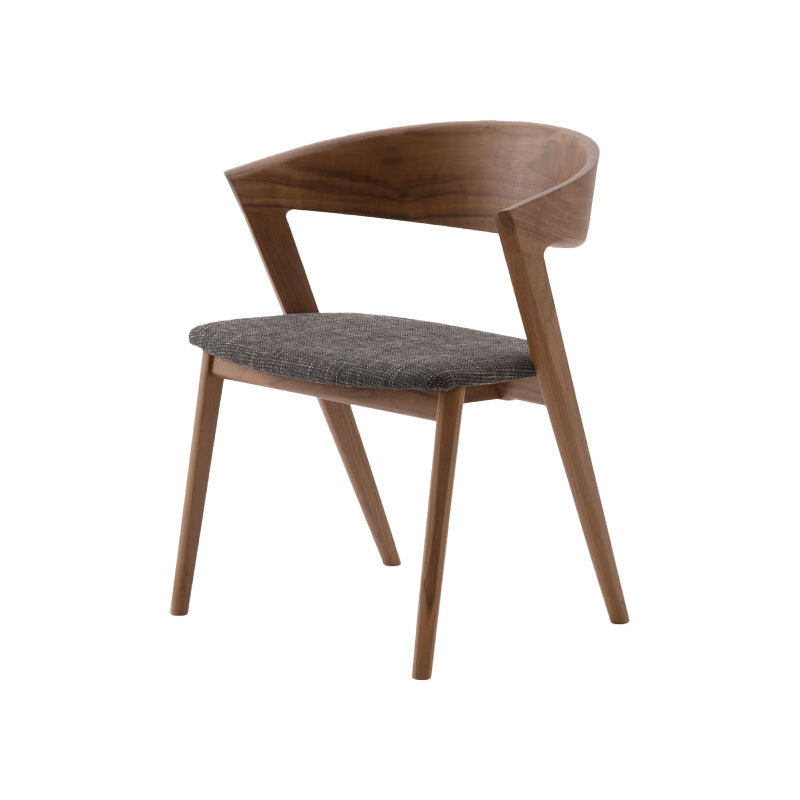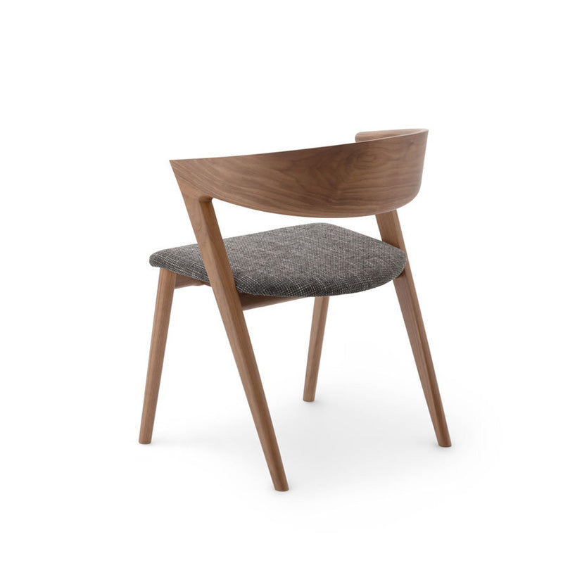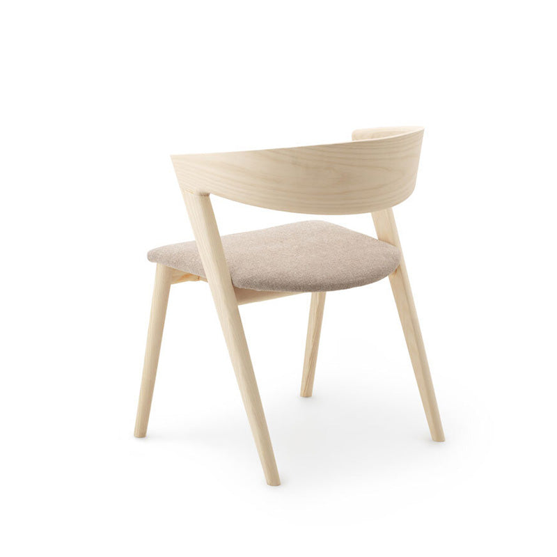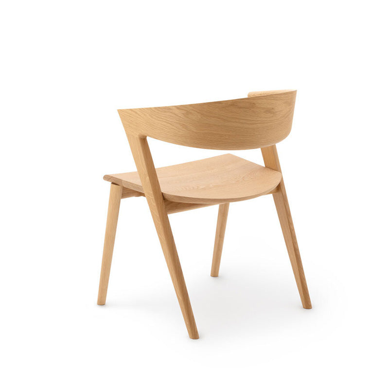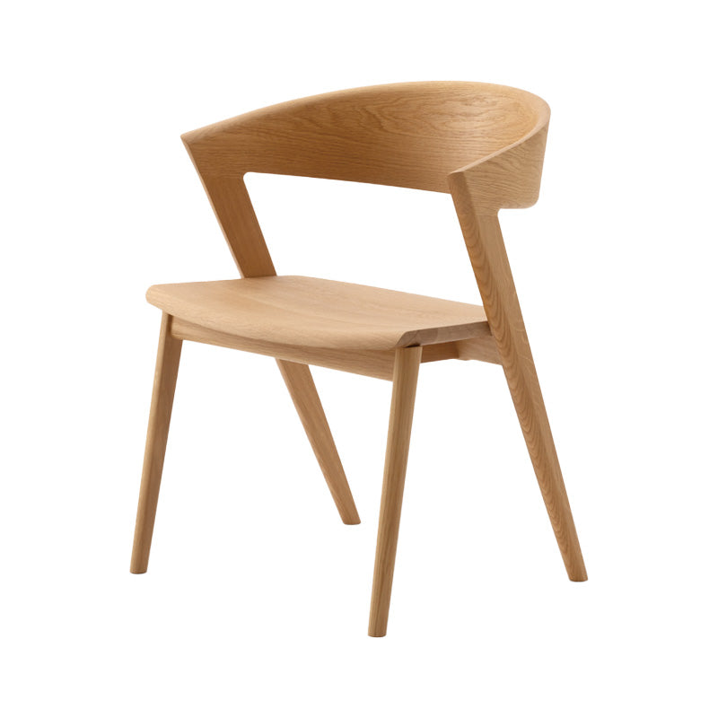 イストクが得意とする高度な曲げ木の技術を使い、1枚の無垢板で笠木をしなやかに湾曲させることに成功。笠木がハープのように大きく湾曲した椅子です。アームから背までが一体で曲げられ、継ぎ目なく木目がつながります。脚からアーム、背へとつながる曲面は身体を包み込むと同時に、優しい旋律を奏でます。