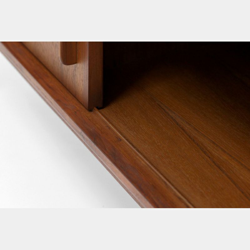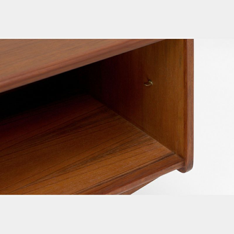 引き戸の中にはHDDレコーダーを収納できるよう配線用の穴が付いており、棚は取り外しも可能です。現代的なパーツを一切使うことなく、引き戸のレールもチーク材で造り、棚板を支えるパーツは真鍮メッキを施したダボを使用しました。チーク材の美しい木目と質感は、ヴィンテージ北欧家具と一緒に置いても違和感なく溶け込んでくれます。